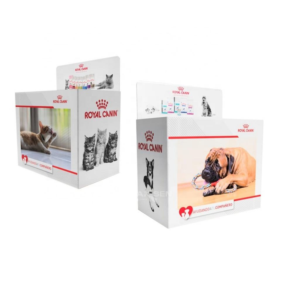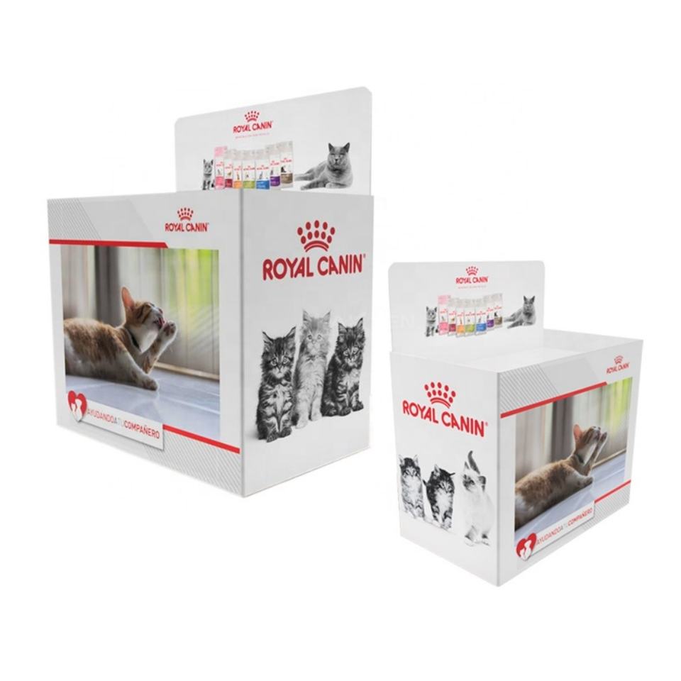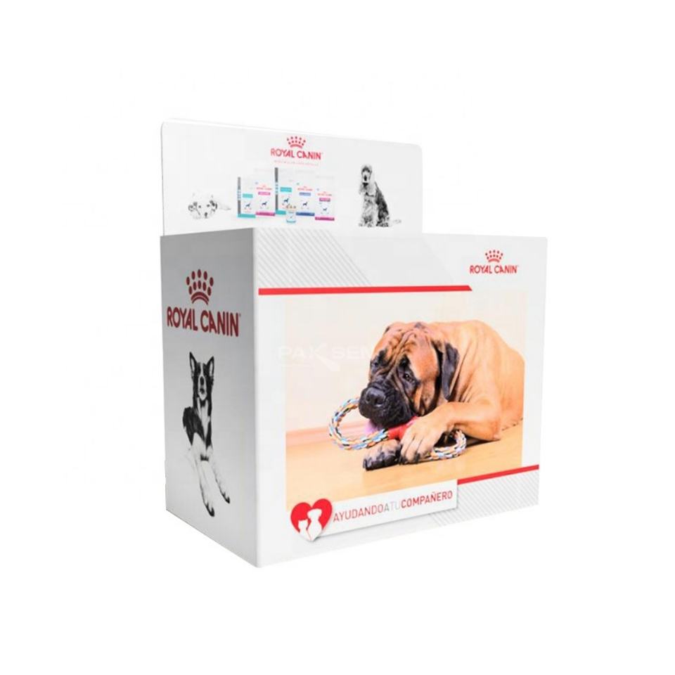 กล่องกระดาษลูกฟูกทรงสี่เหลี่ยมแบบกำหนดเอง เป็นมิตรกับสิ่งแวดล้อม สำหรับจัดแสดงอาหารสัตว์เลี้ยงเพื่อการส่งเสริมการขายในร้านค้าปลีก ทำจากกล่องกระดาษ