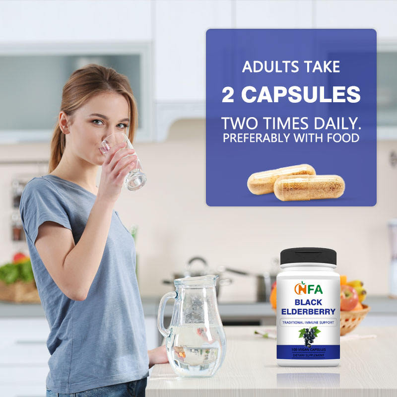 สารสกัดจากผลไม้ชนิด Elderberry ที่กำหนดเองอาหารเสริมสนับสนุนการทำงานของระบบภูมิคุ้มกันที่ดีต่อสุขภาพและช่วยปกป้องแคปซูลเอลเดอร์เบอร์รี่ระบบประสาท