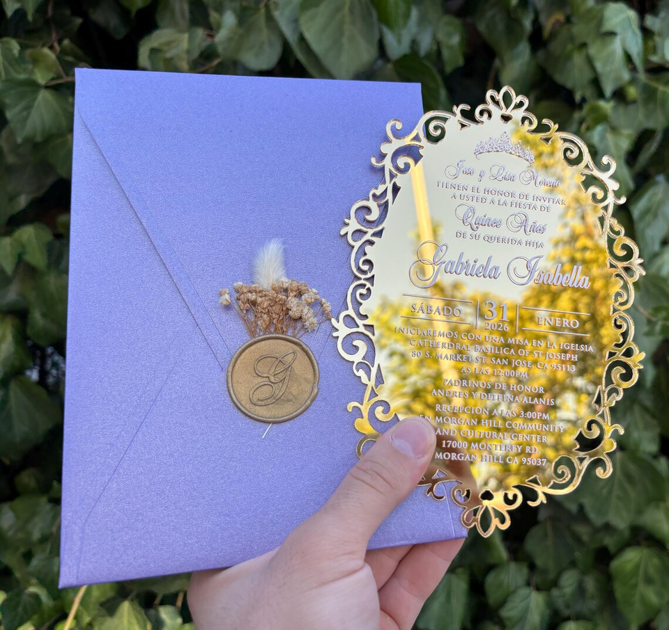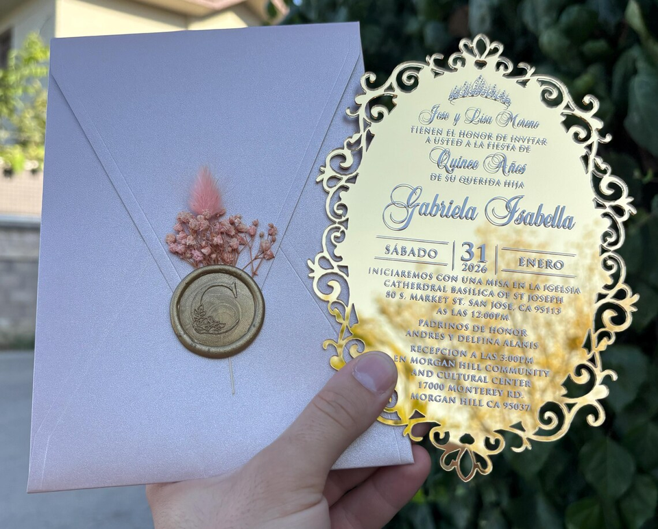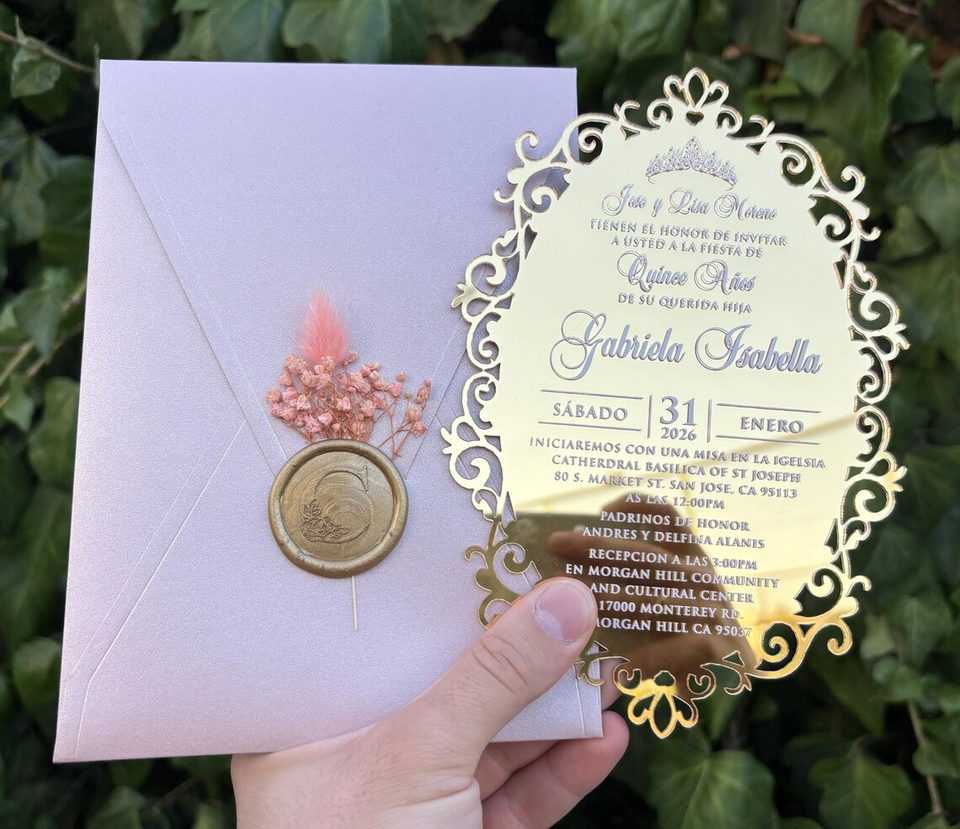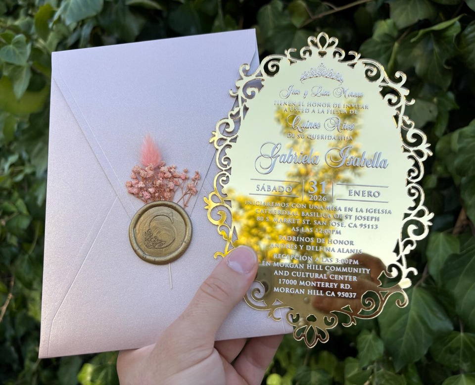 การ์ดเชิญลายกุหลาบเคลือบแวกซ์อะคริลิคกระจกสีทองหรูหราออกแบบได้ตามต้องการ
