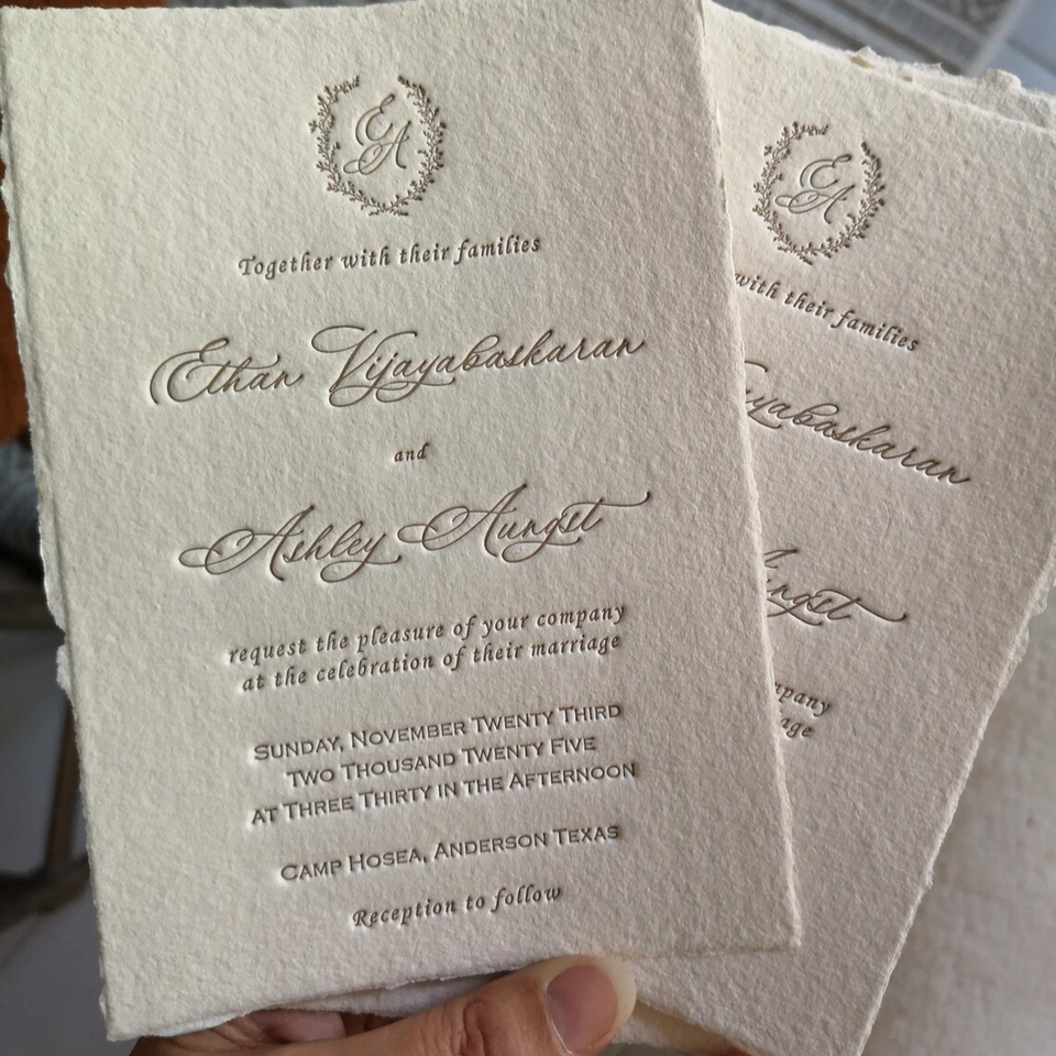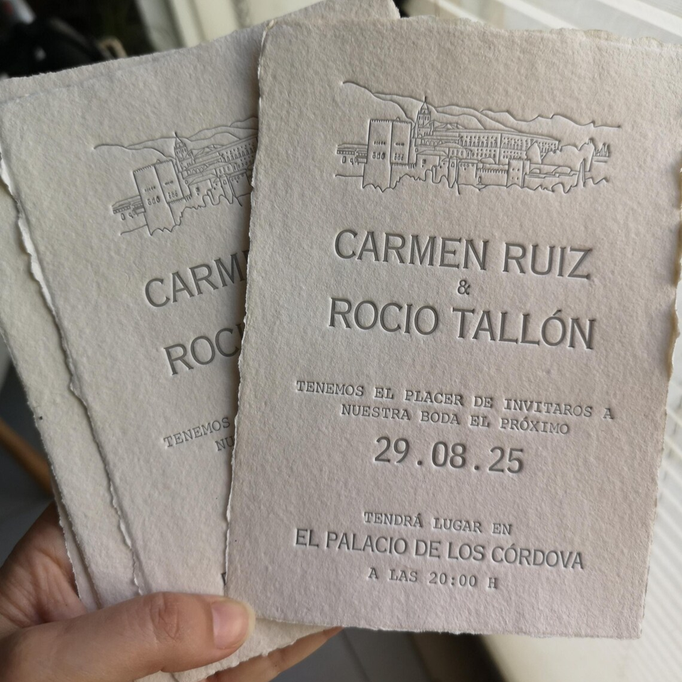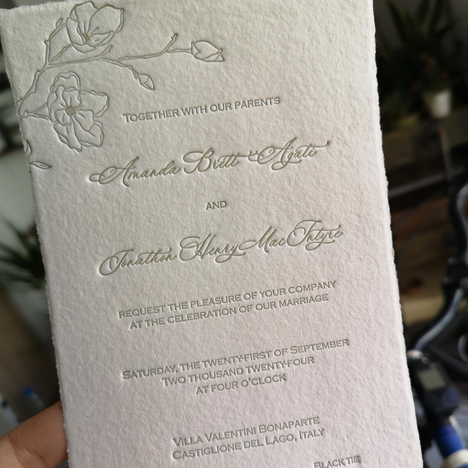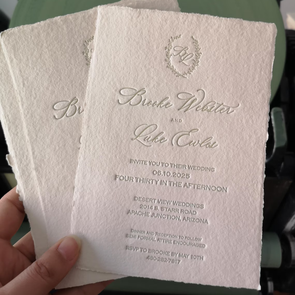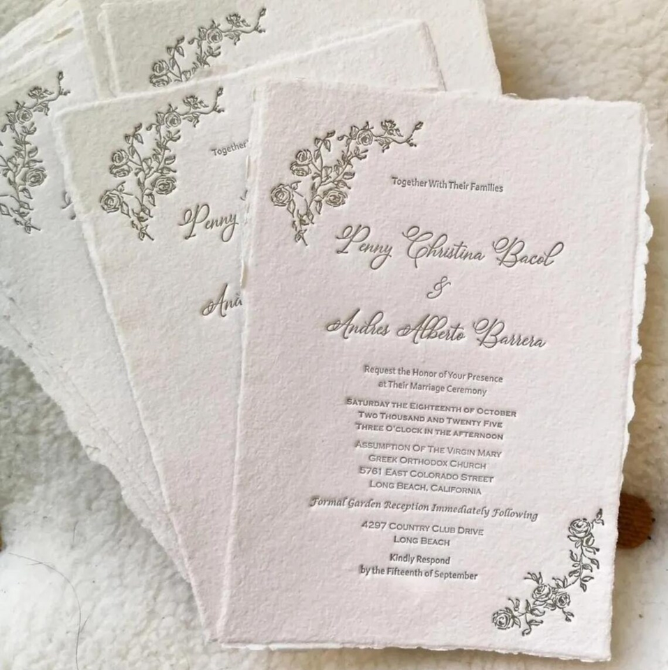 การ์ดเชิญงานแต่งงานทำมือ กระดาษลายนูนขอบหยัก ดีไซน์หรูหรา พร้อมขอบลายดอกไม้ แบบกดนูน งานฝีมือประณีต