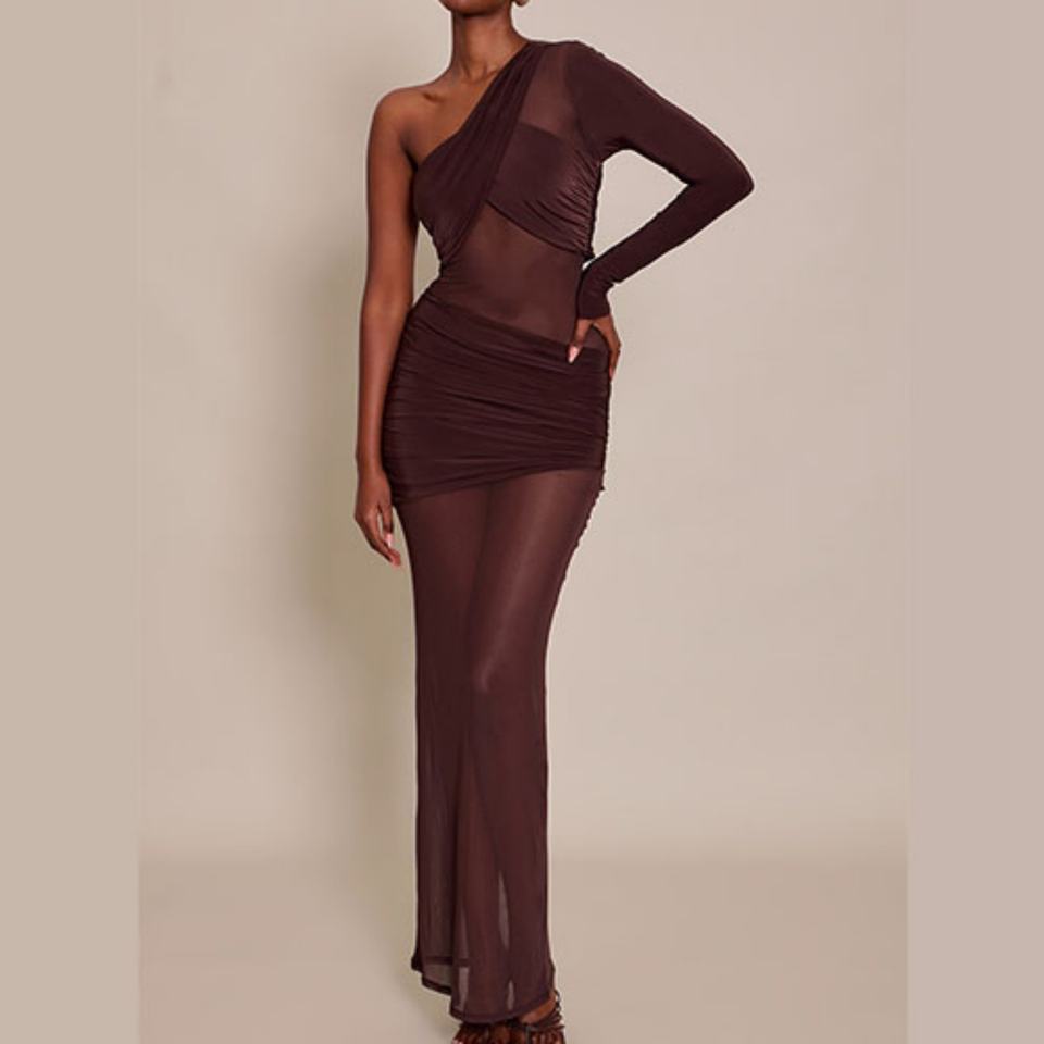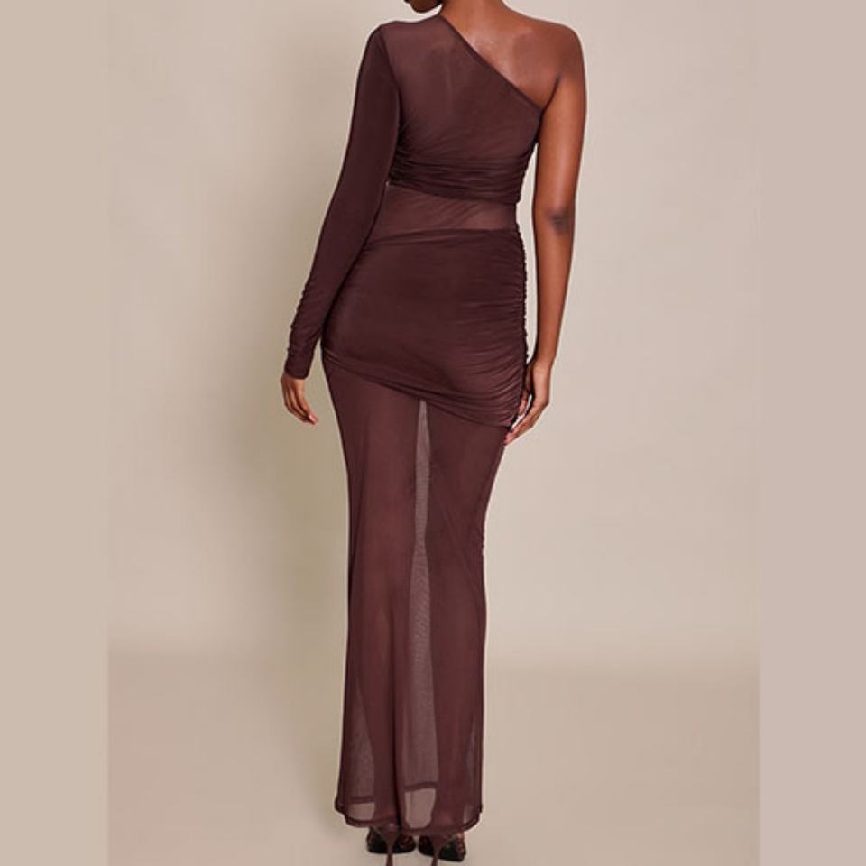 เดรสยาวแบบมีดีเทลตาข่ายสีช็อกโกแลตสำหรับผู้หญิง ดีไซน์หรูหรา แขนเดียว ทรงเข้ารูป เหมาะสำหรับงานปาร์ตี้และคลับ กระโปรงทรงมินิฟิตเข้ารูป