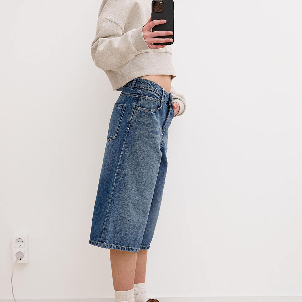 กางเกงขาสั้นผ้ายีนส์ขาตรงเอวสูงสำหรับผู้หญิงกางเกงขาสั้นผ้ายีนส์พิมพ์ลายนูนออกแบบได้ตามต้องการ