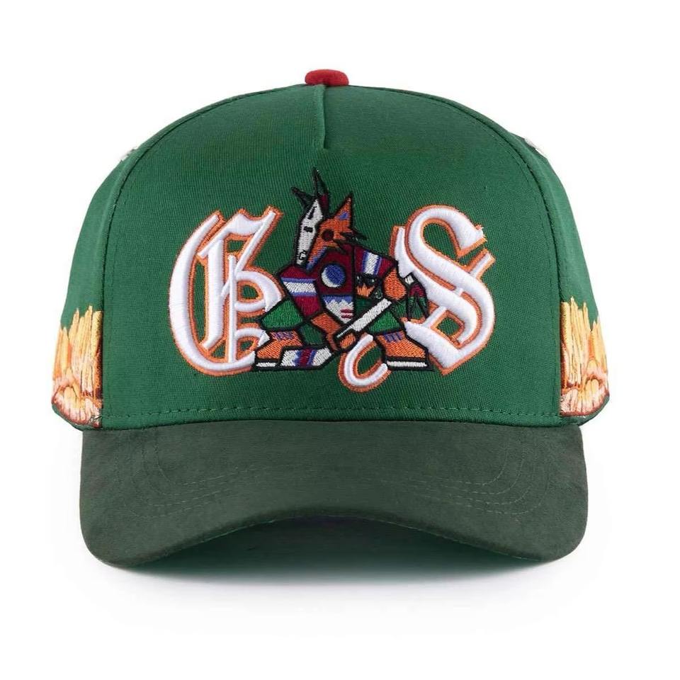 หมวกแก๊ปเบสบอลแบบ 6 แผงปักมือลายอาร์ไกล์ แต่งขอบโลโก้สองสี