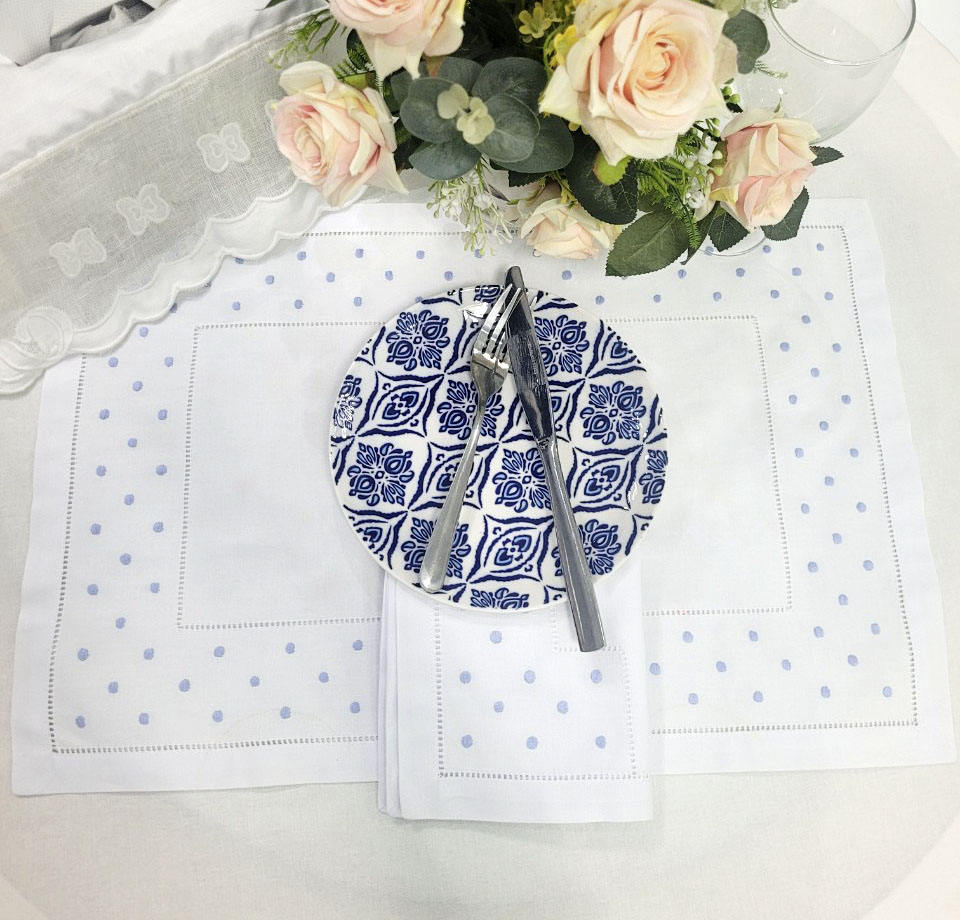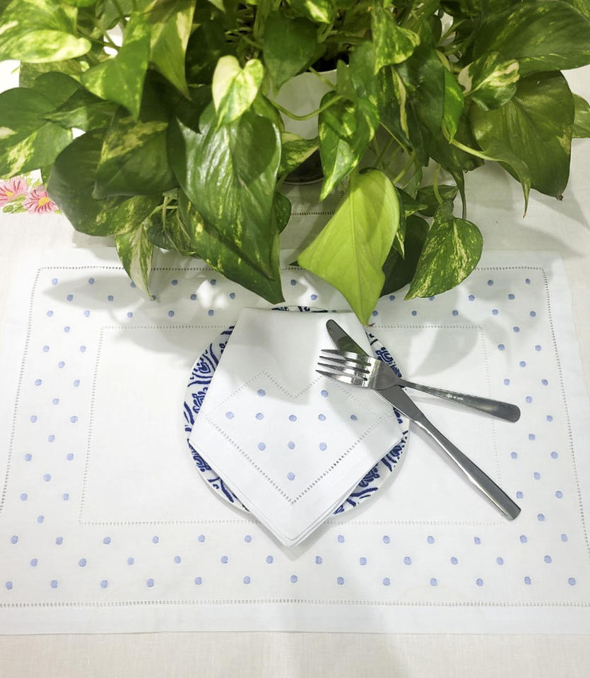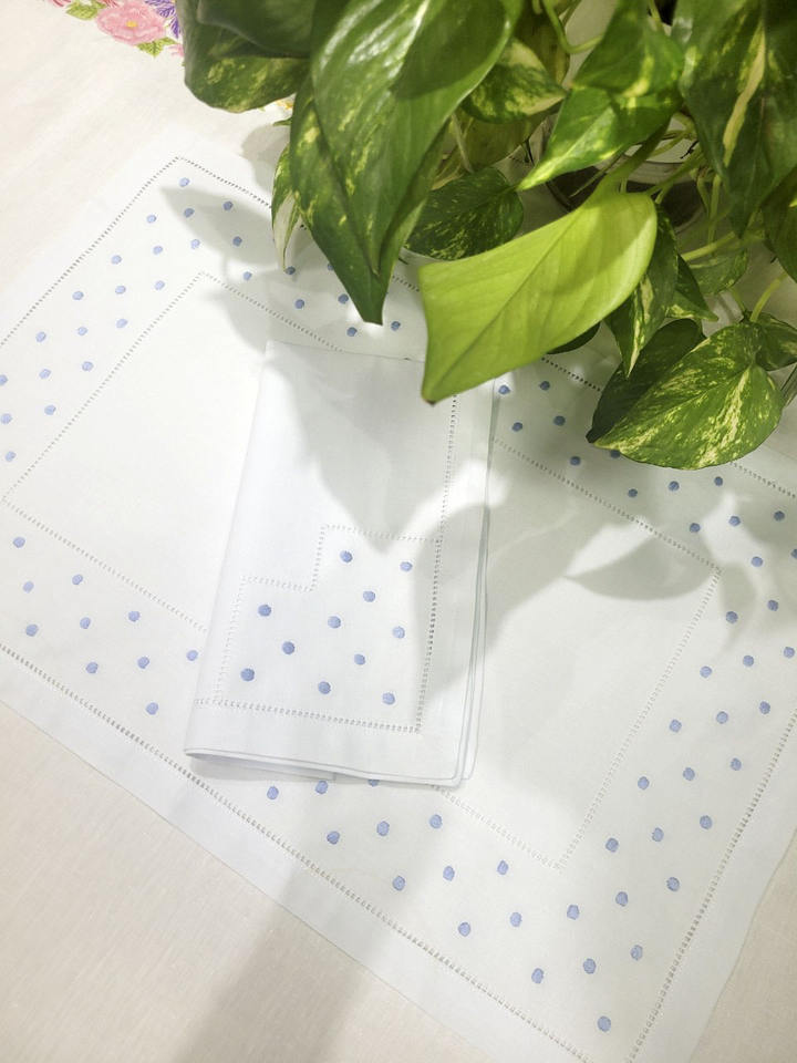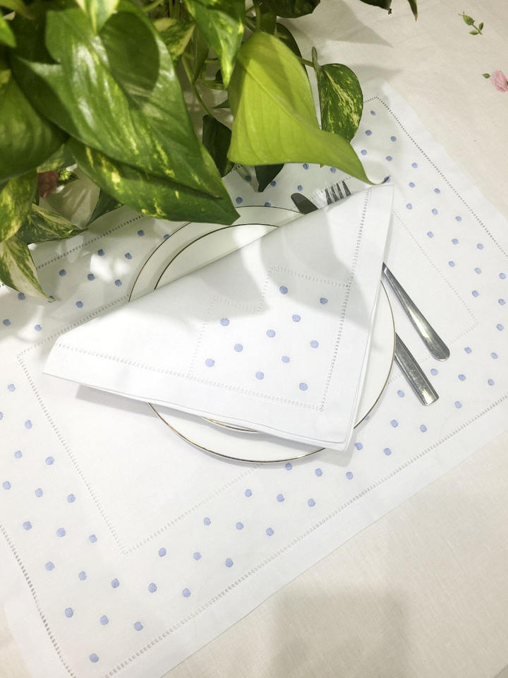 ชุดผ้ารองจานและผ้าเช็ดปากปักลายจุดสีน้ำเงินแบบกำหนดเอง พร้อมขอบเย็บสองชั้น ผ้าฝ้ายสีขาว สำหรับใช้ในบ้าน โรงแรม ร้านอาหาร และงานอีเว้นท์