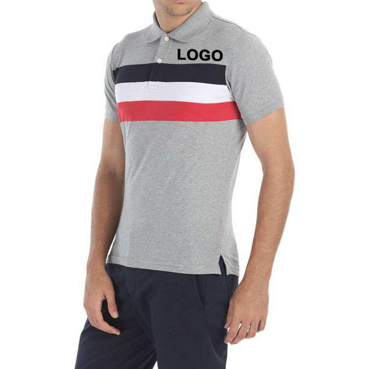 เสื้อยืดลำลองของผู้ชายผ้าคอตตอนปักโลโก้แบบกำหนดเองระบายอากาศได้คอปกลายทางสำหรับเล่นกีฬา100% โลโก้พิมพ์ลายด้านหน้า