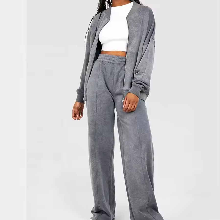 ชุดวอร์มผู้หญิงผ้าโพลีเอสเตอร์ 100% น้ำหนักเบา ระบายอากาศได้ดี ซิปหน้า ลวดลายปักโลโก้ตามสั่ง ล้างสีแบบ Acid Wash สำหรับฤดูหนาว