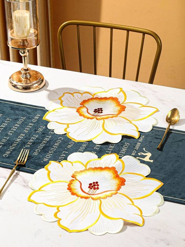ชุดแผ่นรองจานและผ้าเช็ดปากปักลายดอกบัวแบบกำหนดเอง ผ้าลินินสีขาวหรูหรา สำหรับใช้ในบ้าน ร้านอาหาร งานแต่งงาน
