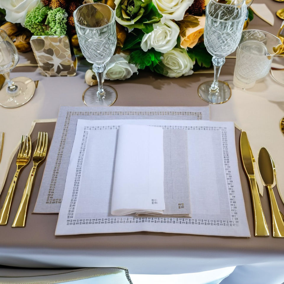 ชุดผ้าปูรองจานผ้าลินินลายเรขาคณิตสีเงินแบบสั่งทำสามารถซักได้สำหรับงานแต่งงานและงานอีเวนต์ที่บ้าน