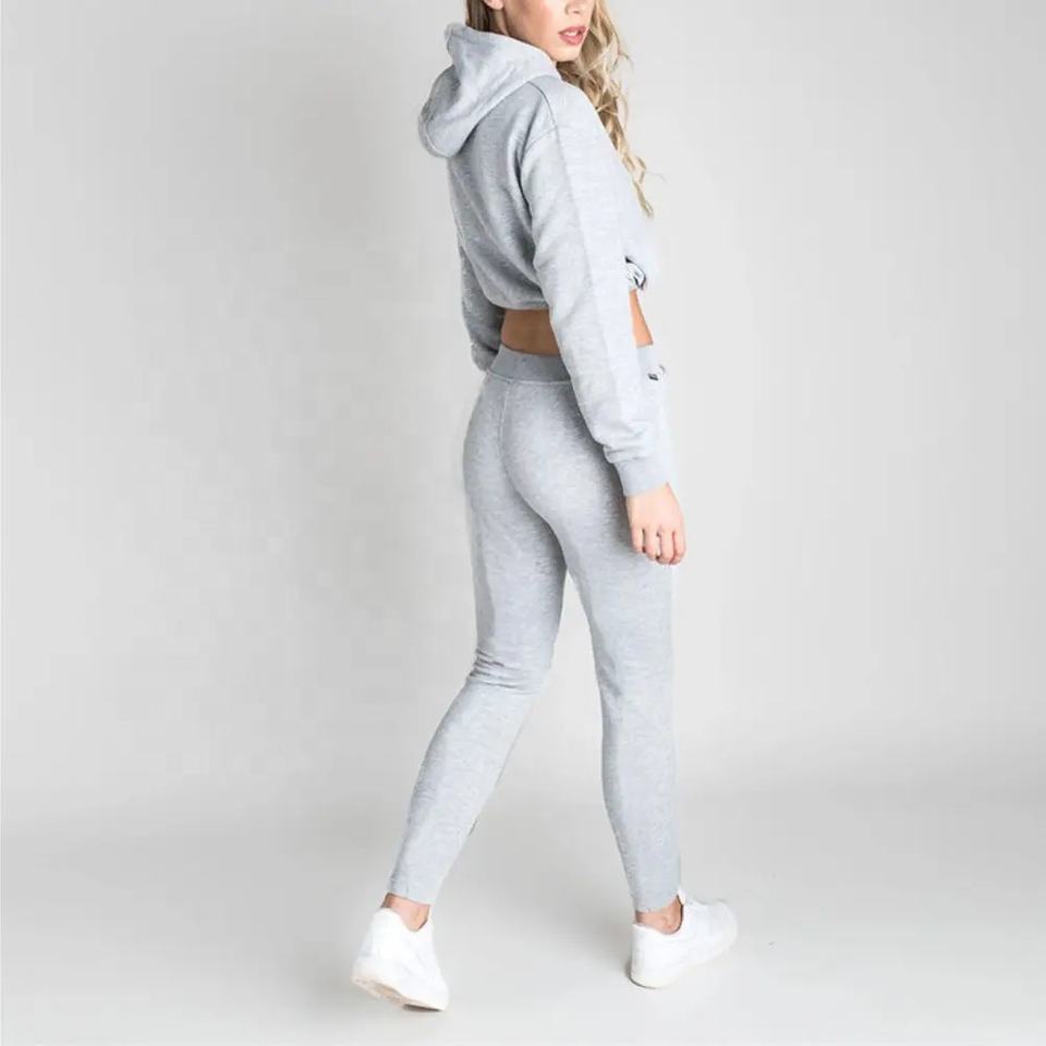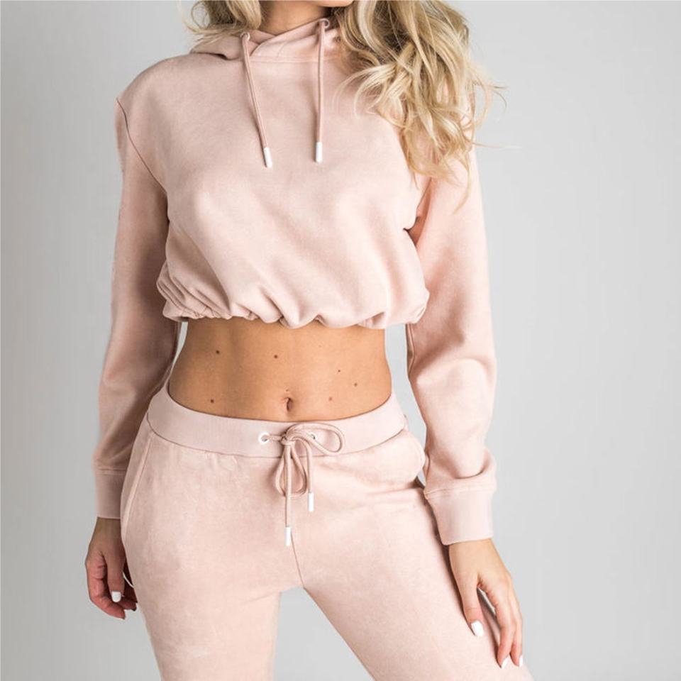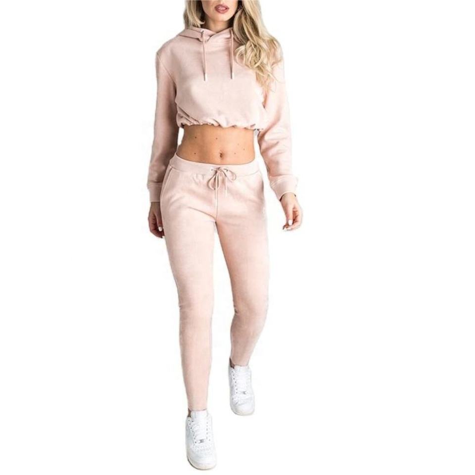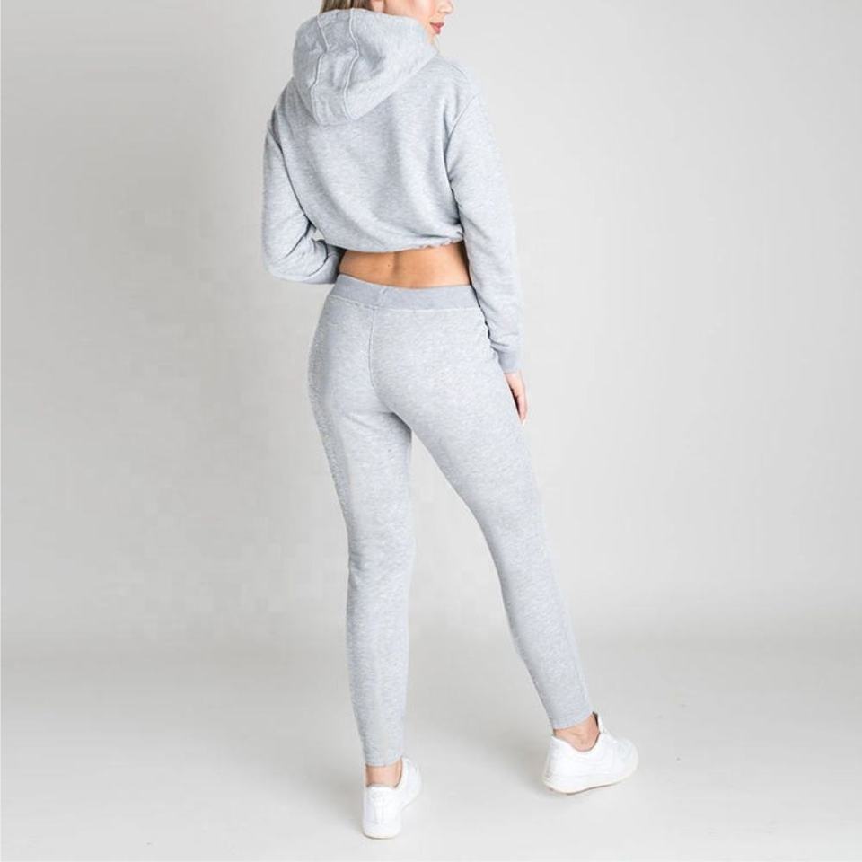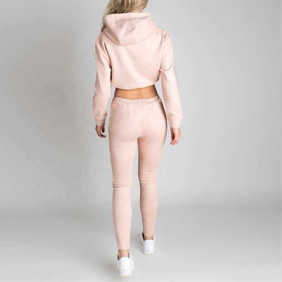 ชุดเซ็ตเสื้อฮู้ดครอปท็อปและกางเกงขายาวปักโลโก้ตามสั่ง ขายส่งสำหรับฤดูหนาว แบบ unisex 2 ชิ้น