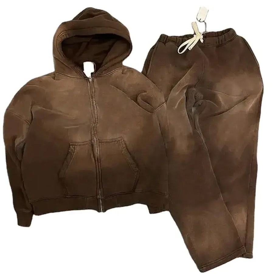เสื้อวอร์มปักลายกรดมีซิปแบบกำหนดเอง500มีฮู้ดผ้าฝ้าย GSM เฟรนช์เทอร์รี่กางเกงขาบานสำหรับฤดูหนาวพลอยเทียม