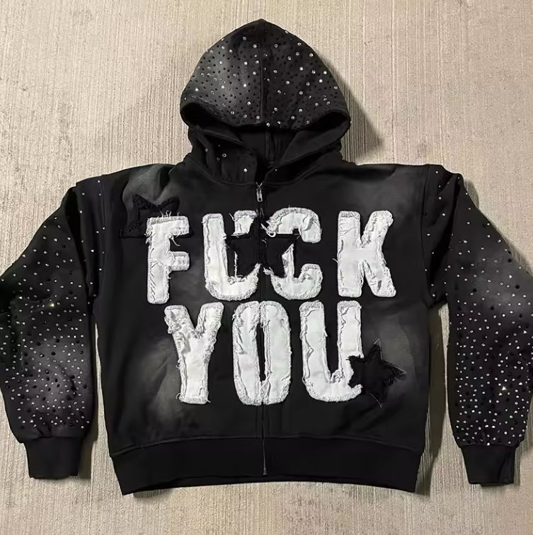เสื้อแจ็คเก็ตซิปผู้ชายประดับพลอยเทียมปักลายกำหนดเองได้เสื้อฟลีซซักแบบวินเทจมีฮู้ดผ้าคอตตอน100% สไตล์สตรีทแวร์