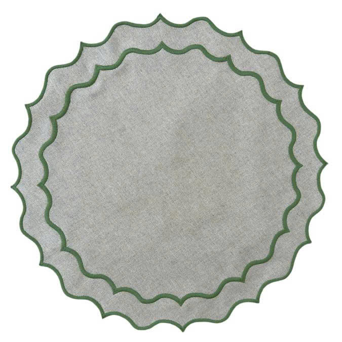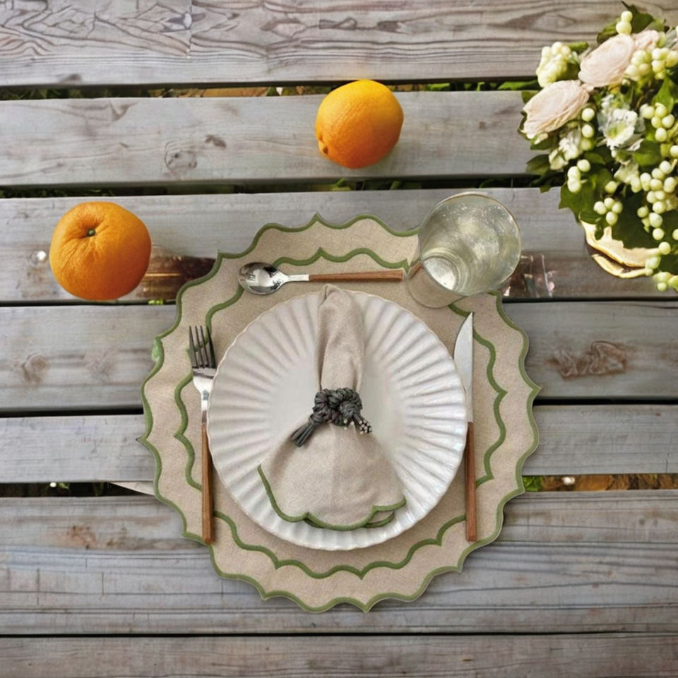 ชุดผ้ารองจานและผ้าเช็ดปากปักลายขอบหยักสีเขียว สำหรับใช้ในบ้าน ร้านอาหาร ผลิตจากผ้าลินินผสมฝ้ายธรรมชาติ รูปทรงกลม