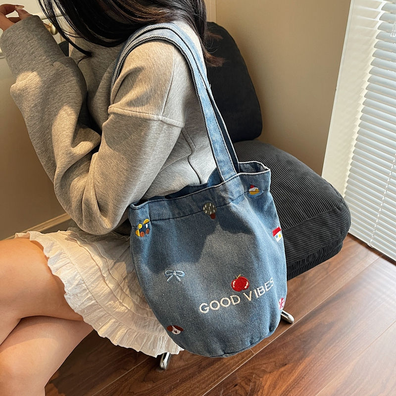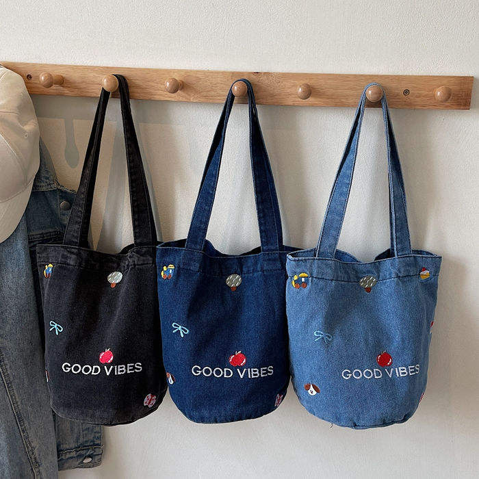 ชื่อผลิตภัณฑ์:กระเป๋าทรงจีบผ้ายีนส์ปักอักษรตามสั่งความจุขนาดใหญ่