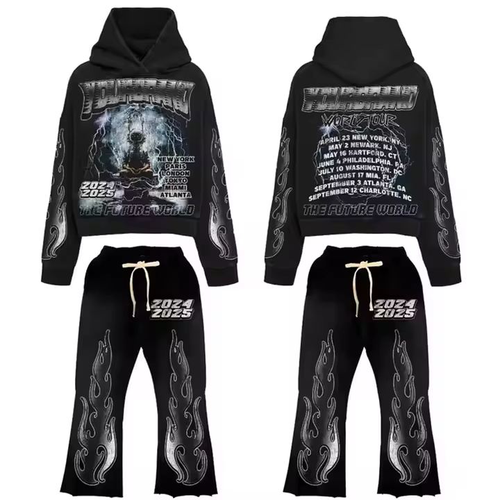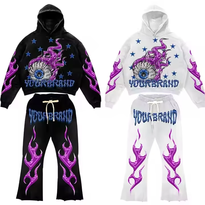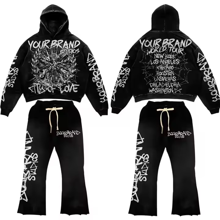 เสื้อฮู้ดดี้วินเทจปักโลโก้แบบกำหนดเอง ผ้าหนา ชุดวอร์มขาบาน กางเกงวอร์มทรงเข้ารูป มีเชือกผูกเอว ผ้าฝ้าย 100% ODM
