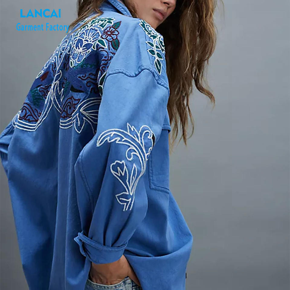เสื้อโอเวอร์ไซส์สำหรับผู้หญิงเสื้อคอตตอนปักลายแบบมีกระดุม
