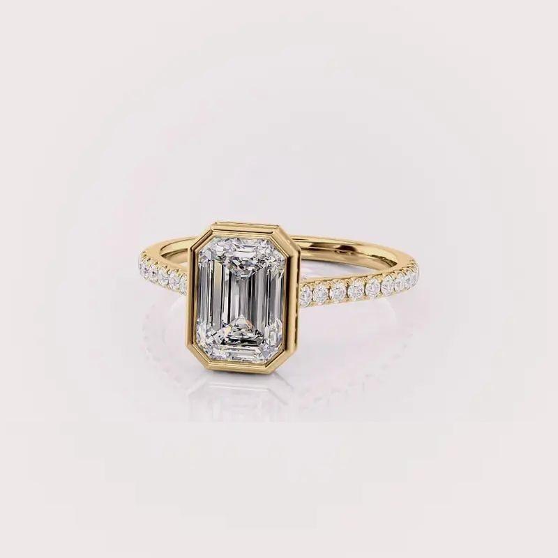 แหวนหมั้นเพชรทรงเอเมอรัลด์สั่งทำพิเศษ เพชรเพาะเลี้ยง ตัวเรือนทองคำขาว/เหลือง/โรสโกลด์ 9K แบบหนามเตย ประดับเพชรแบบพาเว่ ชุบโรเดียม IGI