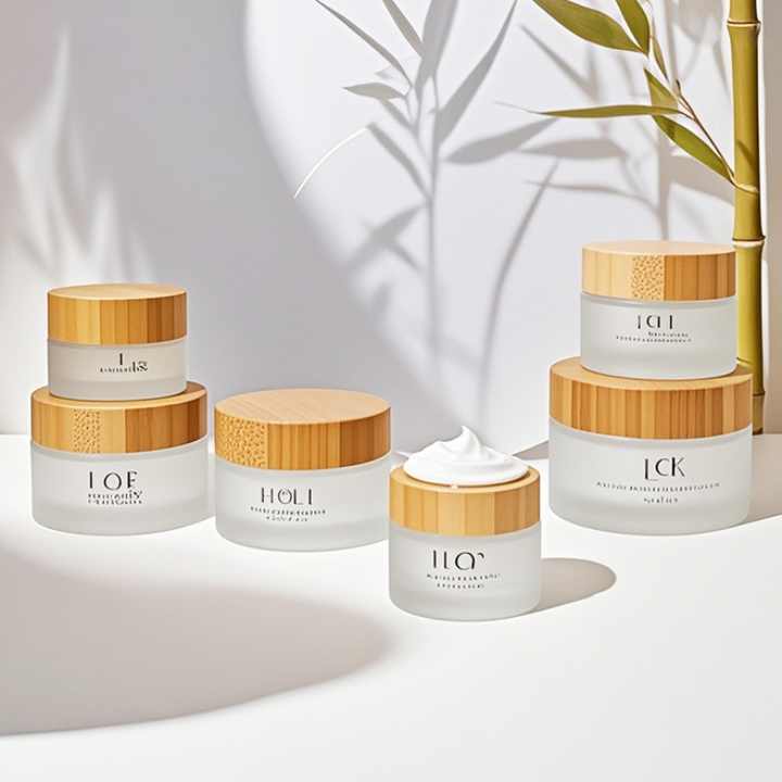 บรรจุภัณฑ์เครื่องสำอางไม้ไผ่แบบกำหนดเอง ขวดครีมเปล่า 30 มล. 50 มล. 100 มล. ขวดแก้วใสฝ้าพร้อมฝาไม้ไผ่