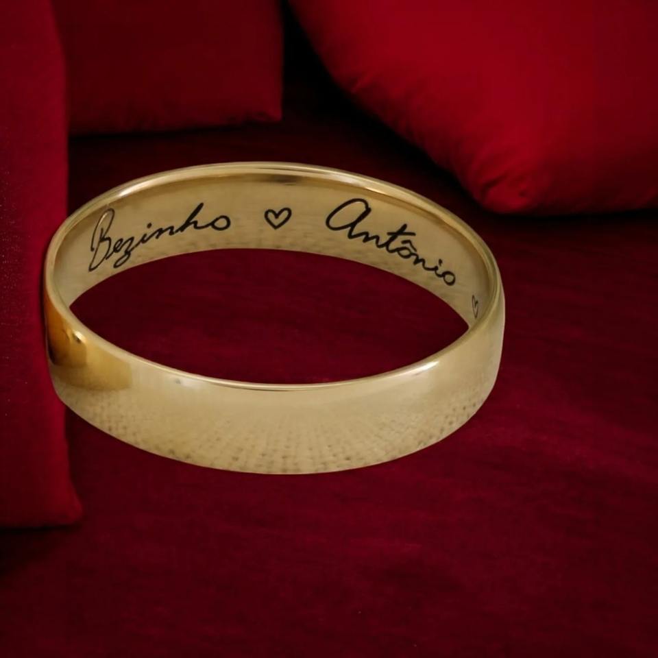 แถบแต่งงานสีทองสลักชื่อและวันที่ด้านในด้วยแหวนคู่ประดับเพชร