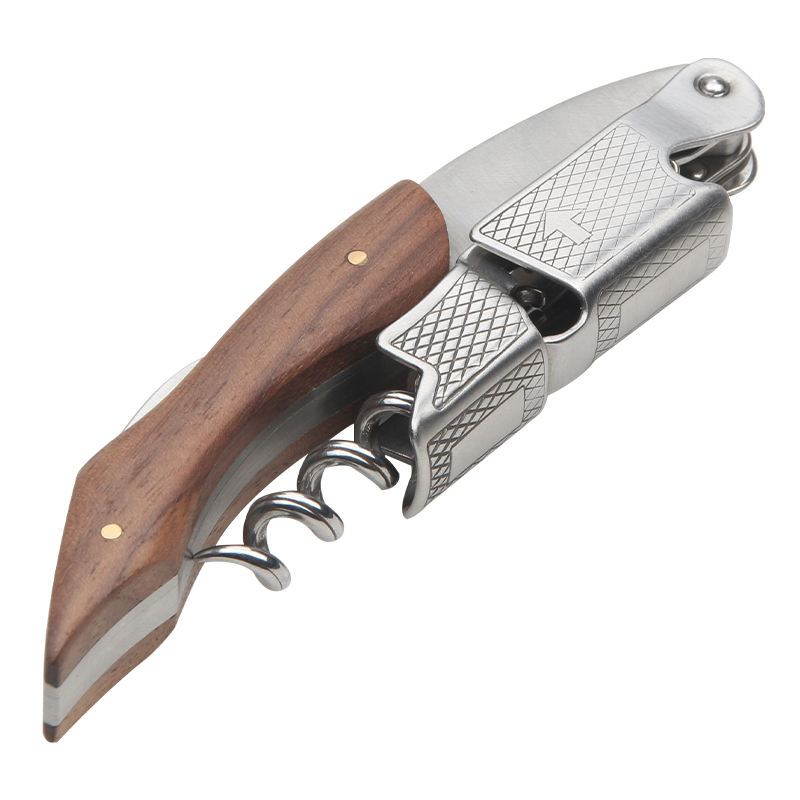 ที่เปิดขวดไวน์สแตนเลสอเนกประสงค์สำหรับกลางแจ้งด้ามจับไม้วอลนัทสลักโลโก้ตามสั่ง