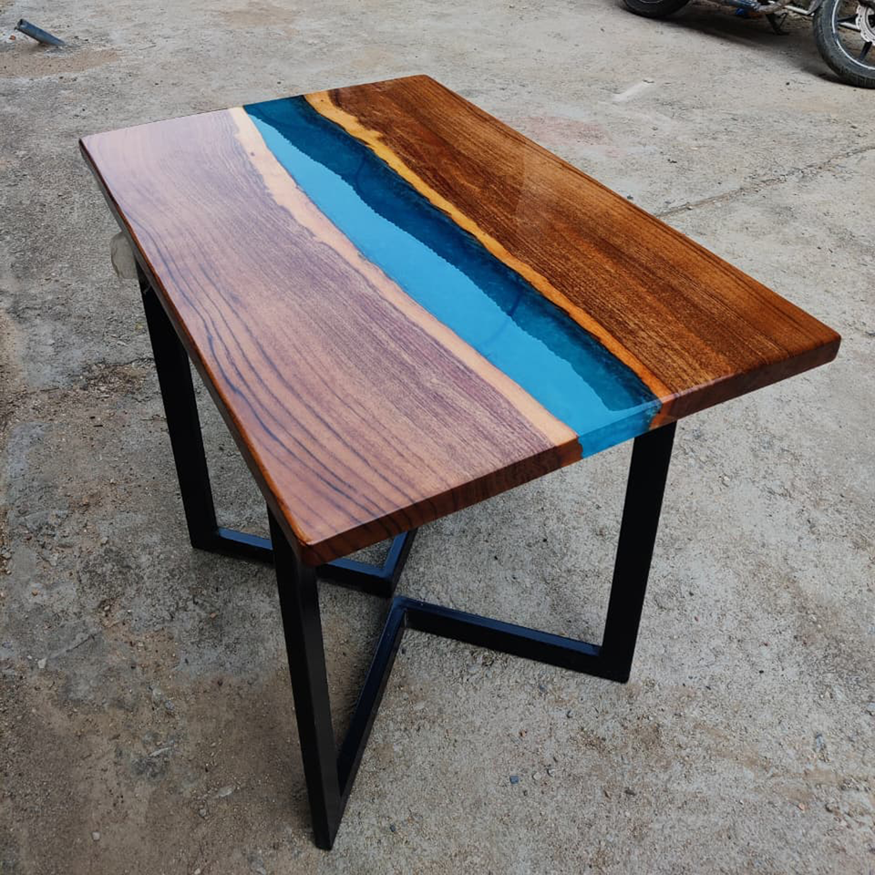 โต๊ะรับประทานอาหารอีพ็อกซี่แผ่นอะคาเซียพื้นผิวมันวาวสูงขาโลหะขนาดเล็กพื้นที่ร้านอาหารวิลล่าขายส่ง