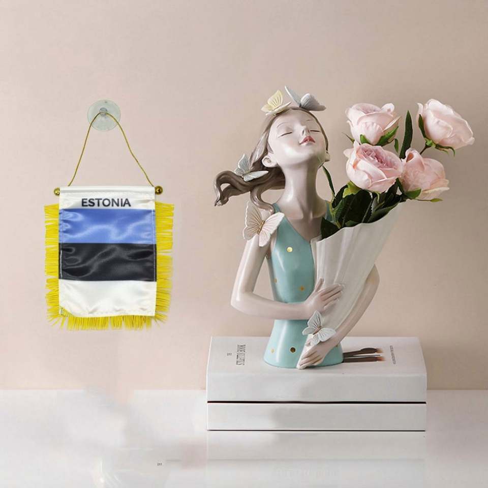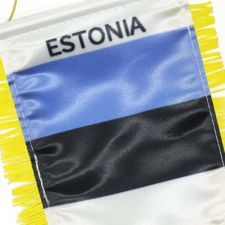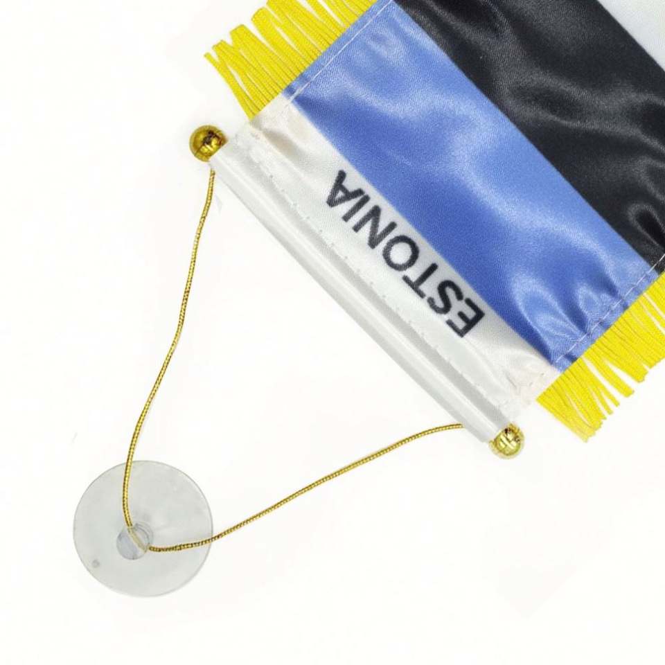ธงสามเหลี่ยมซาตินแบบกำหนดเองของเอสโตเนียสำหรับรถยนต์ พิมพ์ดิจิทัลขนาดเล็ก พร้อมพู่สีเหลือง ทำจากโพลีเอสเตอร์พลาสติก สำหรับใช้กับยานยนต์