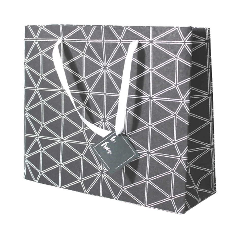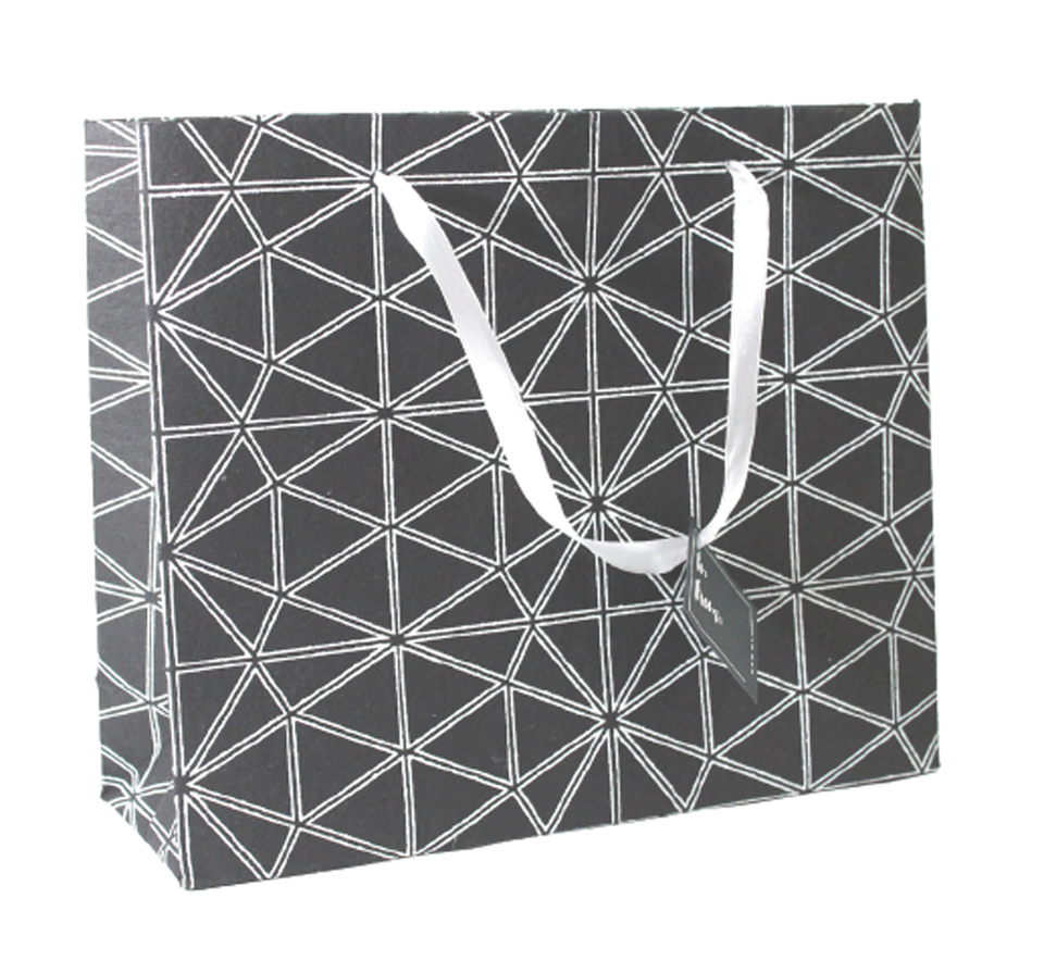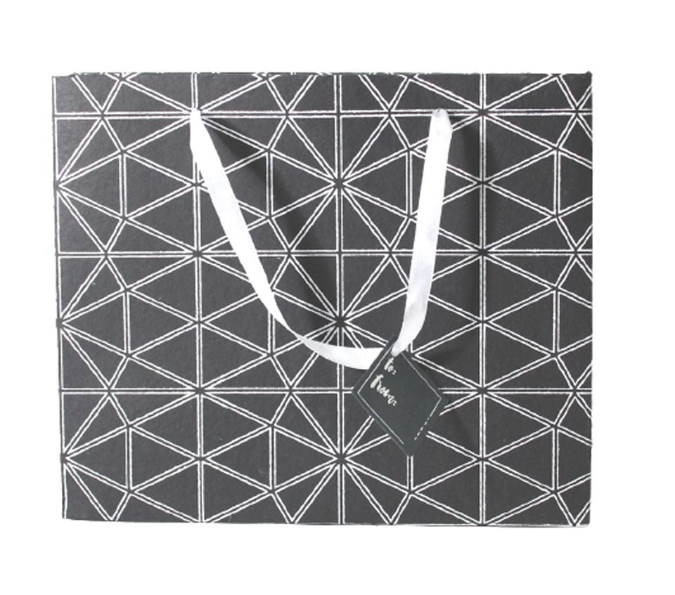 ถุงช้อปปิ้งทำมือคุณภาพสูงจากโรงงาน ผลิตจากกระดาษฝ้ายสีดำ พิมพ์ด้วยหมึกสีขาว พร้อมหูหิ้วริบบิ้นผ้าซาตินเข้าชุด