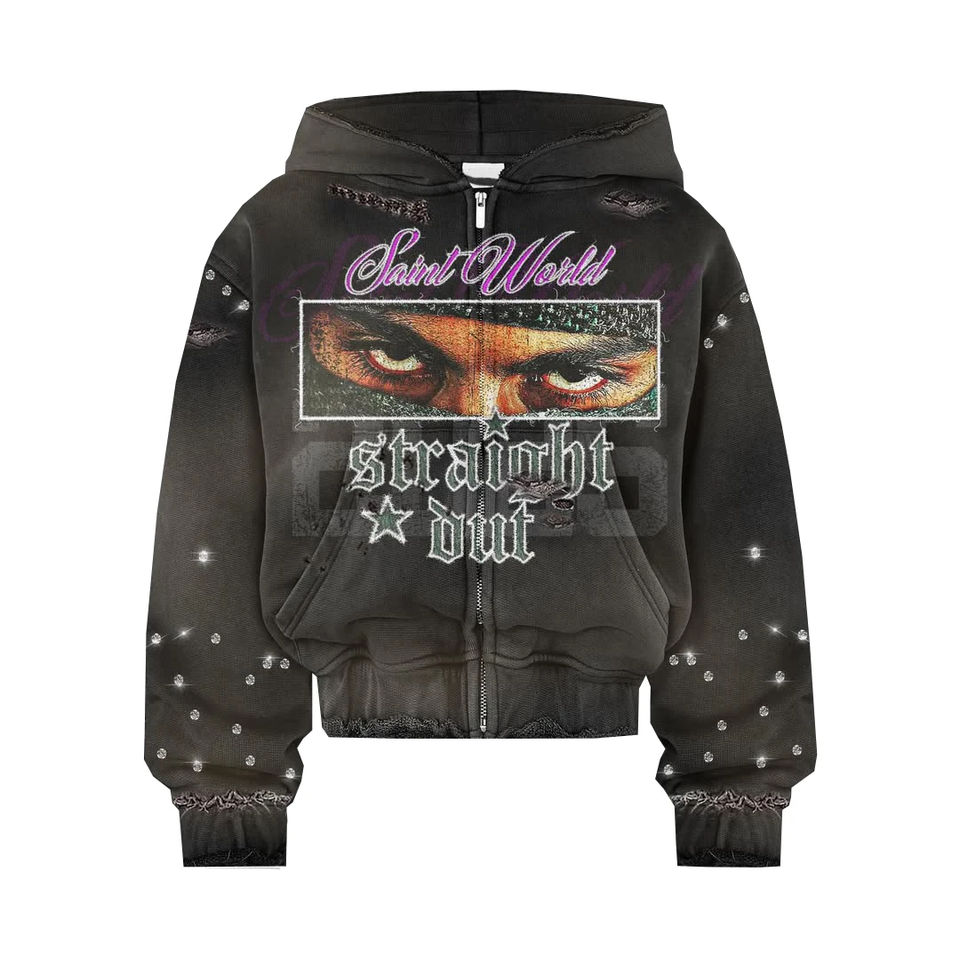 เสื้อฮู้ดดี้แฟชั่นทรงบ็อกซี่โอเวอร์ไซส์แบบครอป ผ้าเฟรนช์เทอร์รี่เนื้อหนา ล้างสีแบบแอซิดวอช แต่งรอยขาด ประดับคริสตัล ซิปด้านหน้า