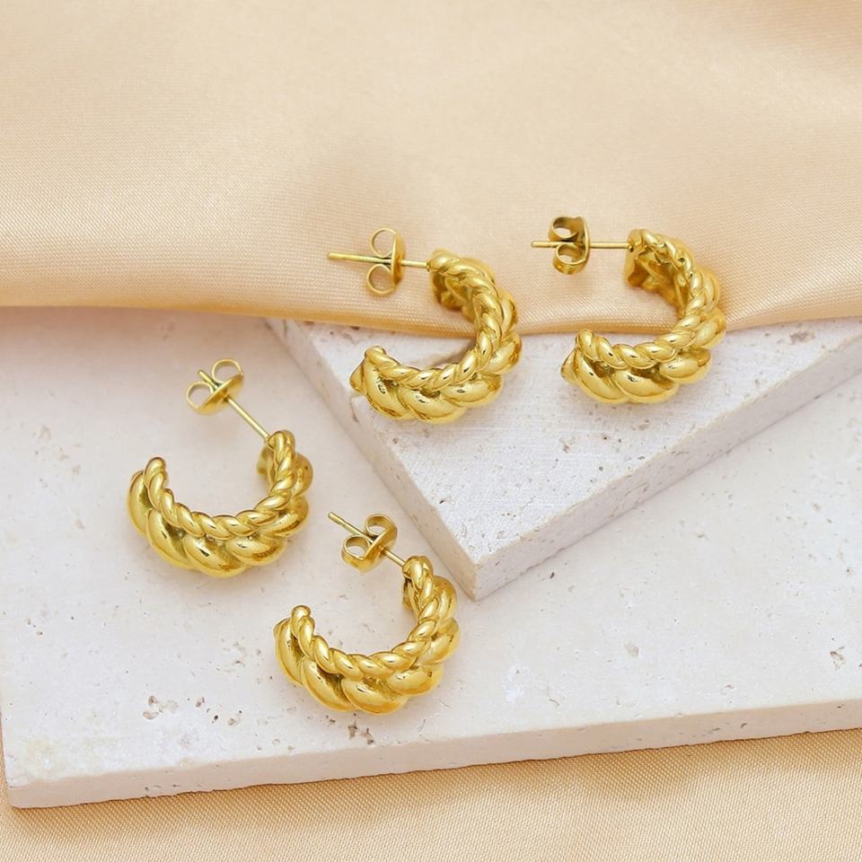 เครื่องประดับแฟชั่นสั่งทำ ต่างหูห่วงรูปตัว C แบบเชือกเกลียวคู่หนา ชุบทอง 18K ทำจากสแตนเลสสตีล ป้องกันการแพ้ สำหรับผู้หญิง