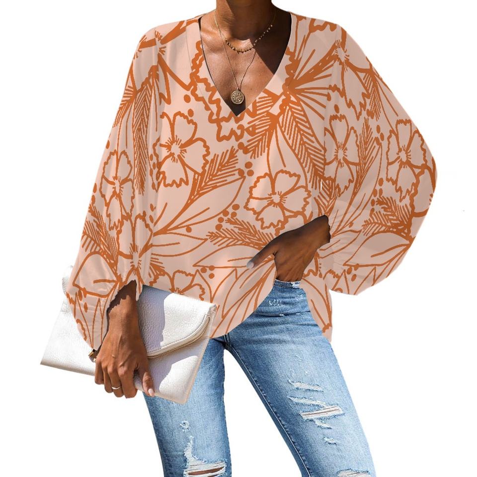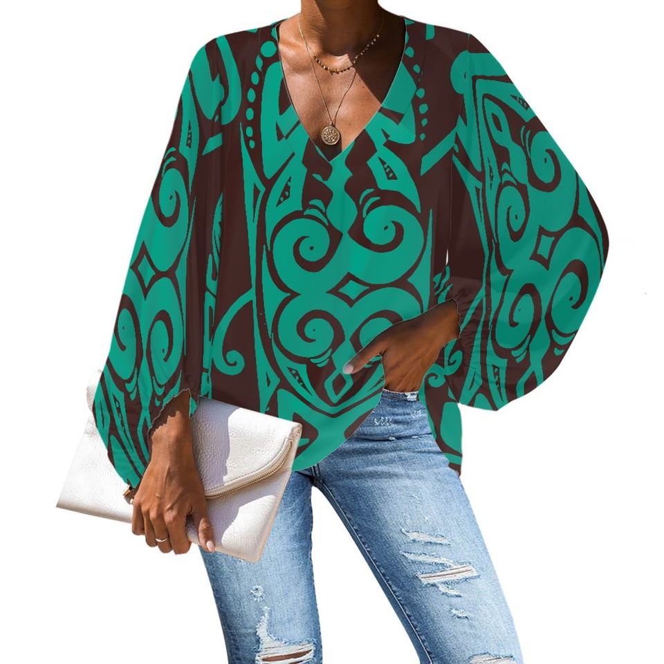 เสื้อเบลาส์แขนยาวผ้าชีฟองสำหรับผู้หญิงเสื้อพิมพ์ลายชนเผ่าซามัว