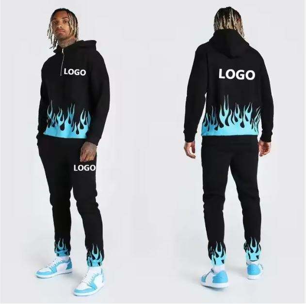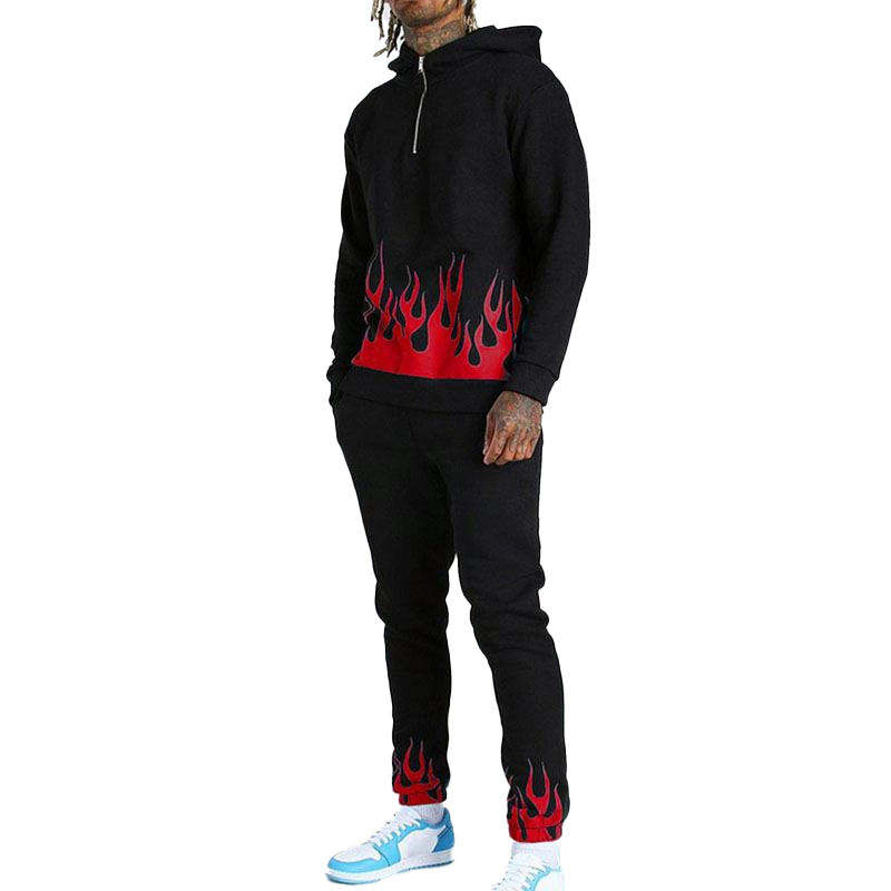 ชุดวอร์มกางเกงวอร์มและมีฮู้ดสำหรับผู้ชายชุดวอร์มสองชิ้นพิมพ์ลายเปลวไฟชุดวอร์มแฟชั่นแนวสตรีทโอเวอร์ไซส์ตามสั่ง