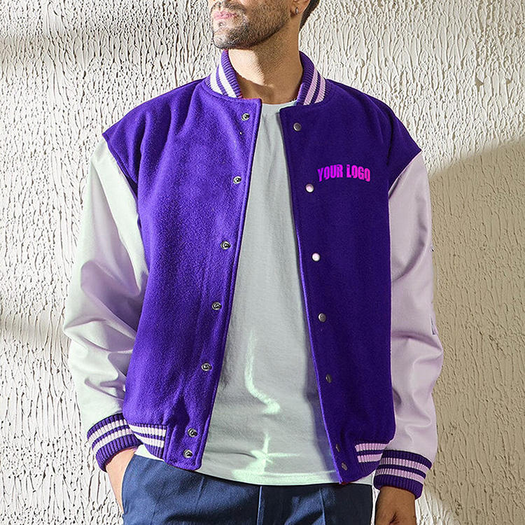 เสื้อแจ็คเก็ตวาร์ซิตี้ผ้าฟลีซแบบกำหนดเองสำหรับผู้ชาย คอตั้ง กันน้ำ แจ็คเก็ตเบสบอลแบบเรียบๆ ขายส่ง เสื้อแจ็คเก็ตลำลองสไตล์วิทยาลัย