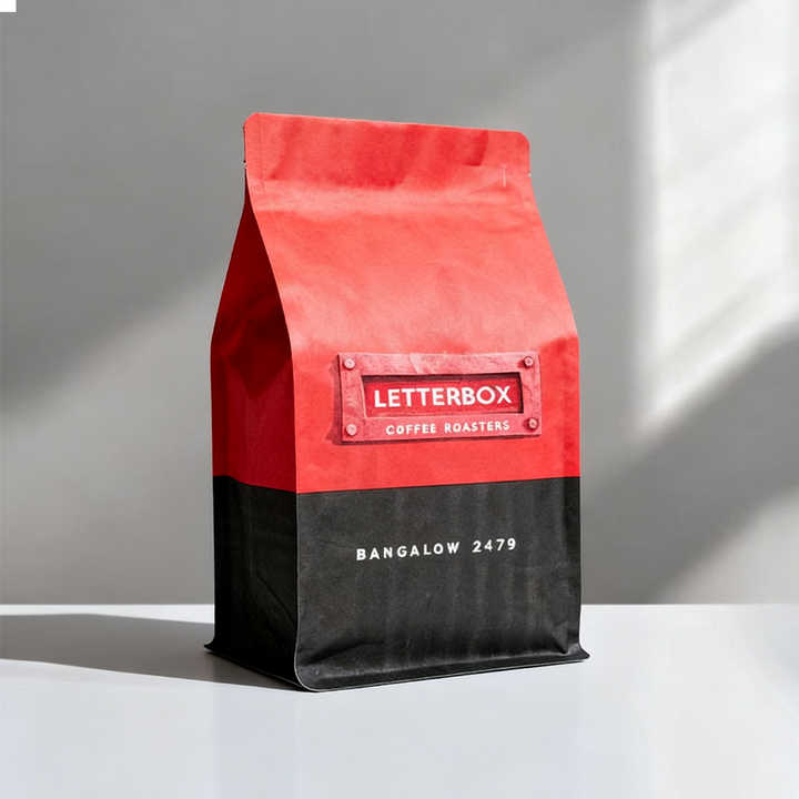 บรรจุภัณฑ์กาแฟแบบกำหนดเองได้ ถุงกาแฟทรงเหลี่ยมก้นแบน มีซิป ทำจากกระดาษคราฟท์สีดำด้าน นำกลับมาใช้ใหม่ได้
