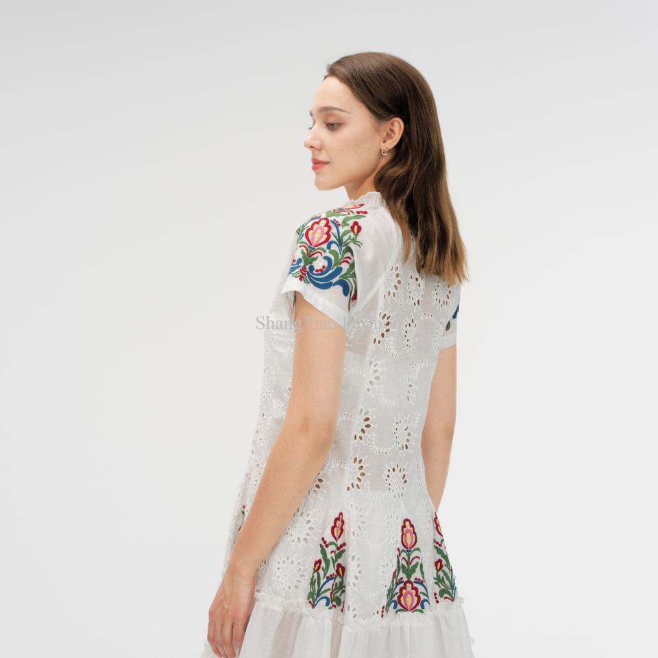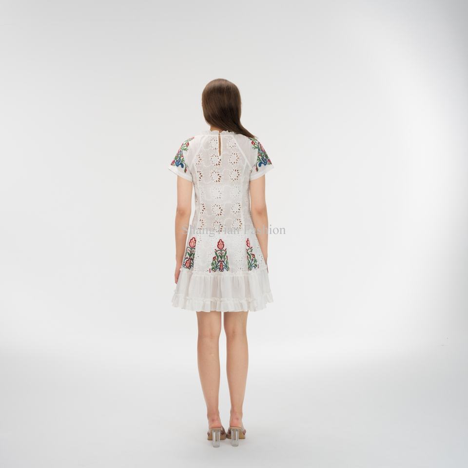 ชุดเดรสลายดอกไม้ผ้าฝ้ายปักลายฉลุ แขนสั้น ชายระบาย สำหรับฤดูร้อนสำหรับผู้หญิง