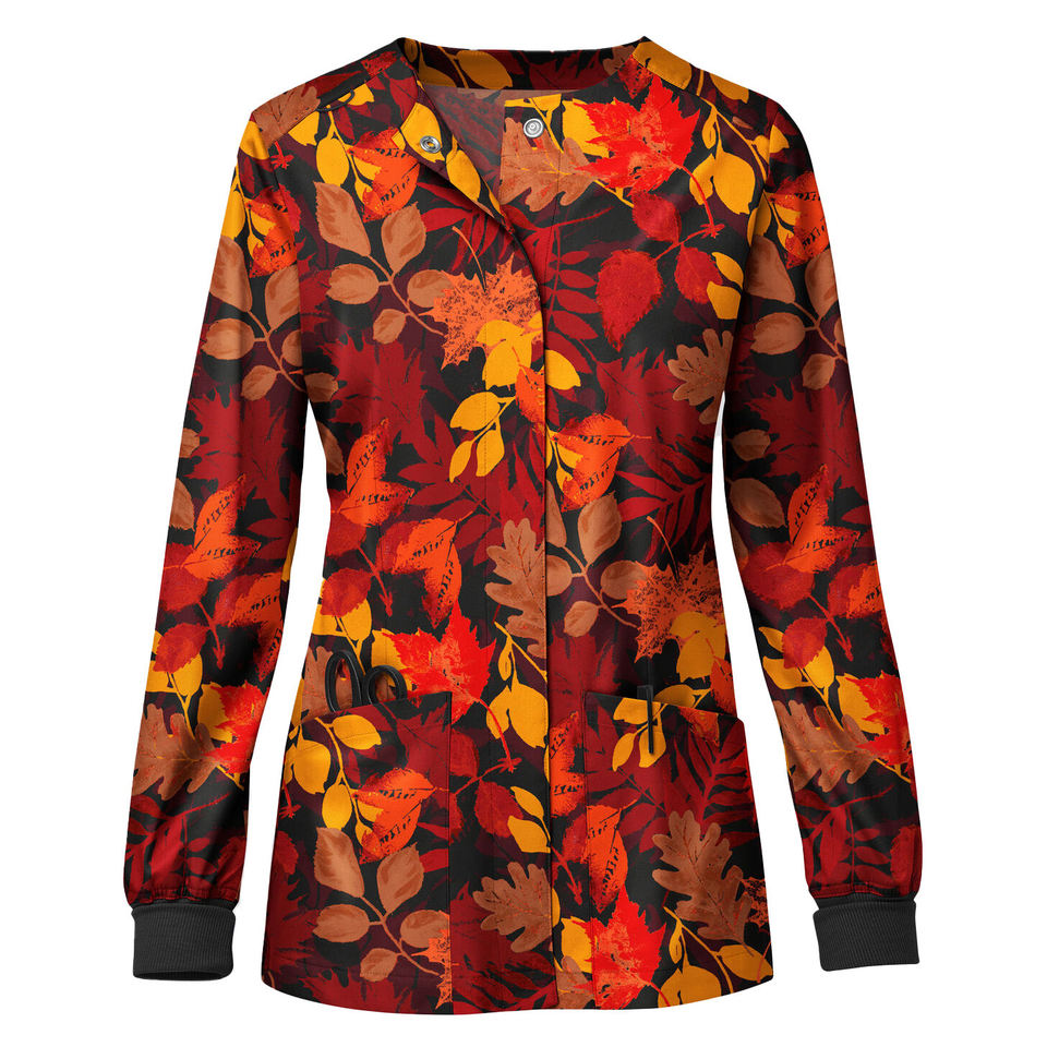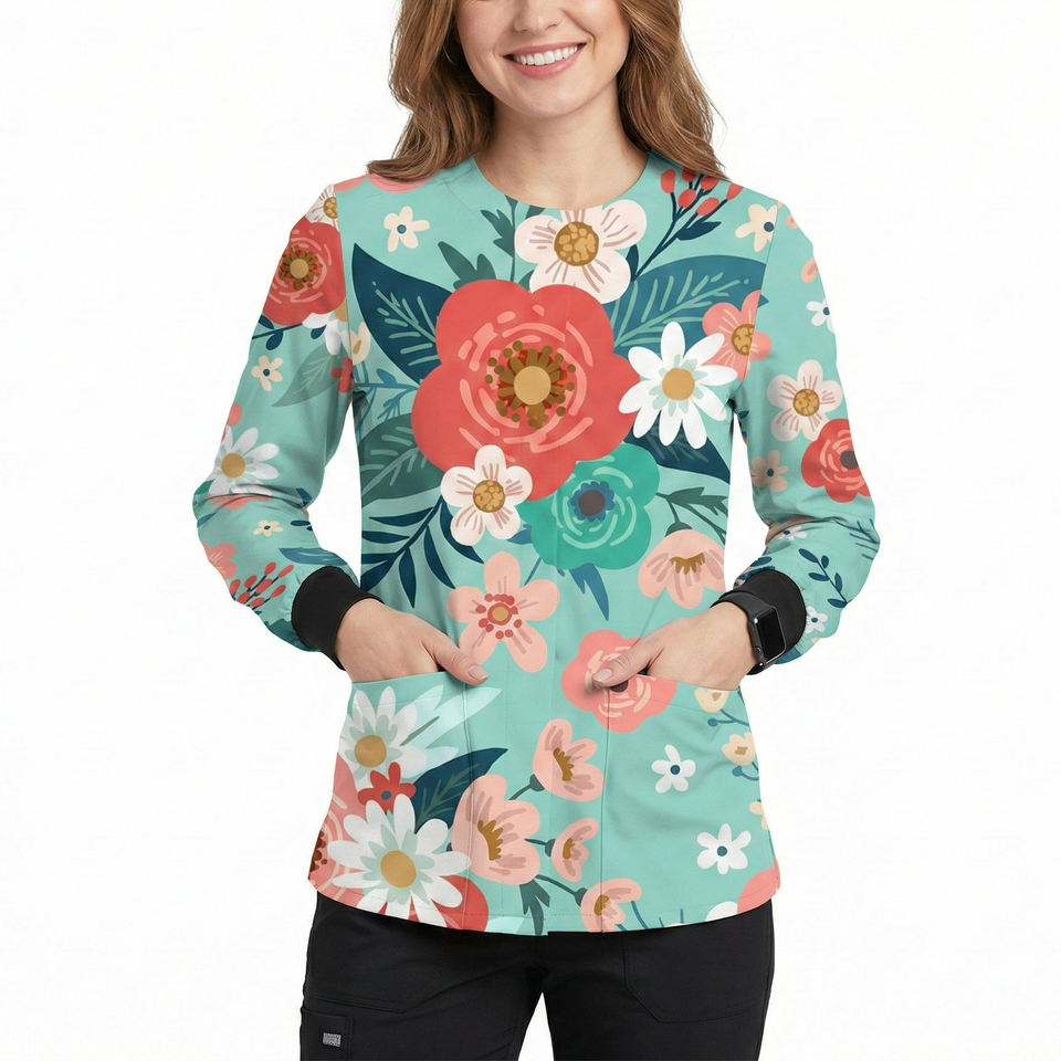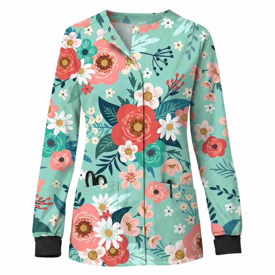 เสื้อแจ็คเก็ตพยาบาลพิมพ์ลายดอกไม้แบบกำหนดเอง ติดกระดุมด้านหน้า แขนยาว สำหรับงานแพทย์ สปา ซาลอน ช่างเสริมสวย เสื้อสครับขายส่ง