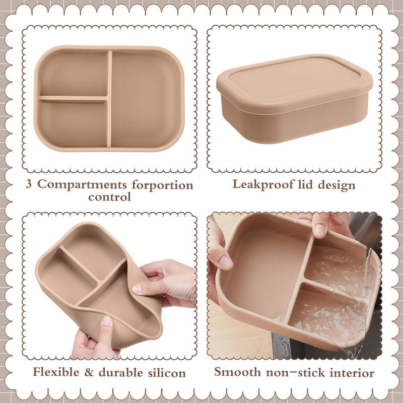กล่องใส่อาหารเด็กแบบซิลิโคนสามช่อง ปลอดสาร BPA เกรดอาหาร ป้องกันการรั่วซึม กล่องข้าวกลางวันแบบเบนโตะ