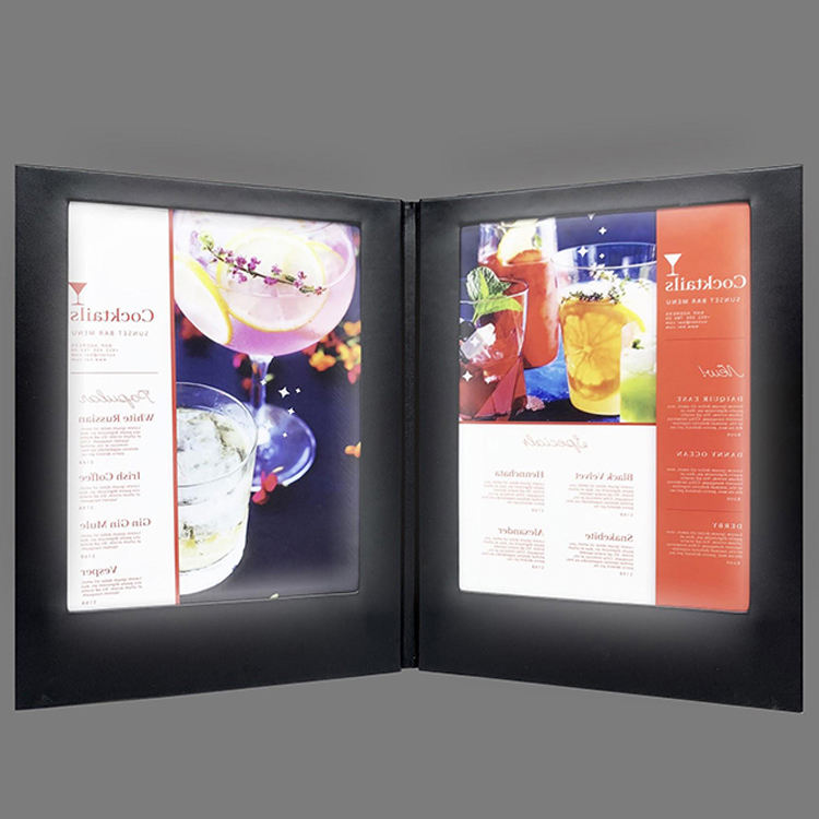 แผ่นปิดเมนูอาหารแบบปรับแต่งได้กระดาษ A4 2มุมมองแบบชาร์จไฟได้ที่ครอบเมนูเครื่องดื่มทำจากหนัง