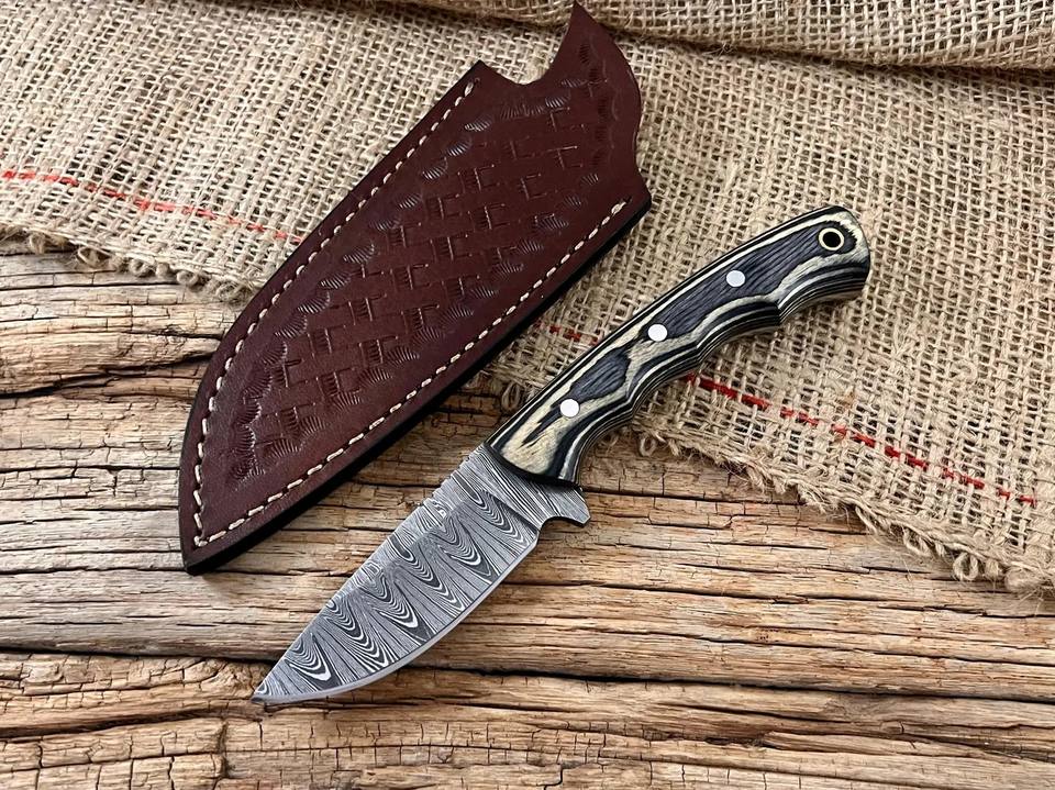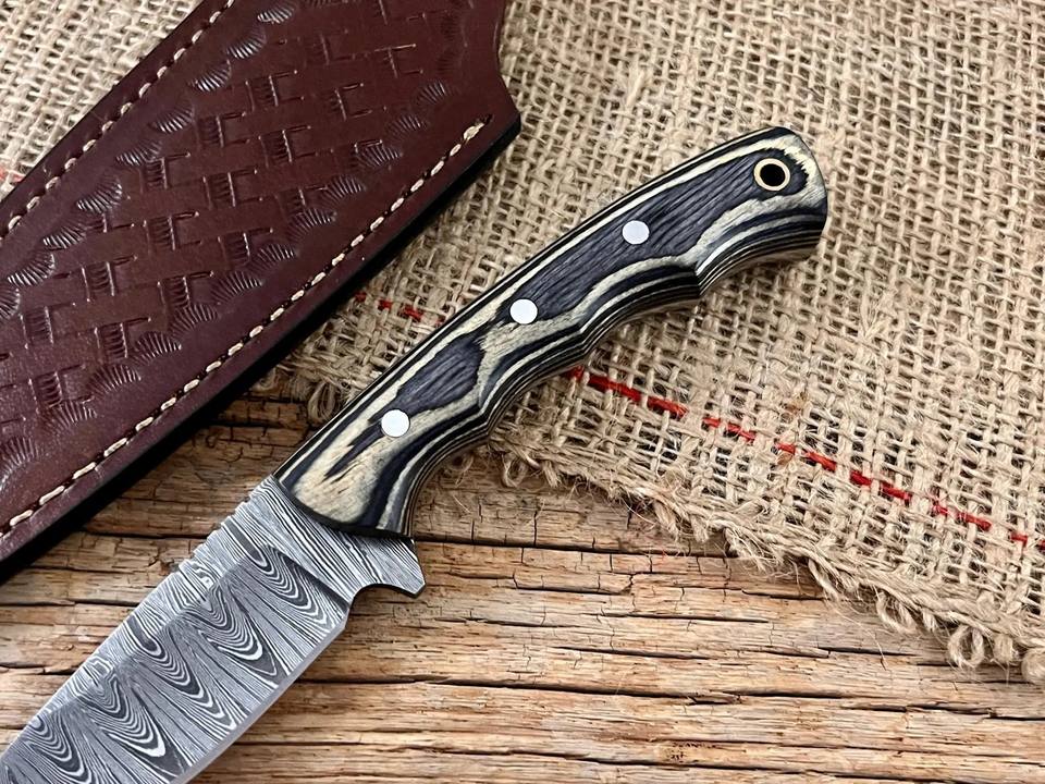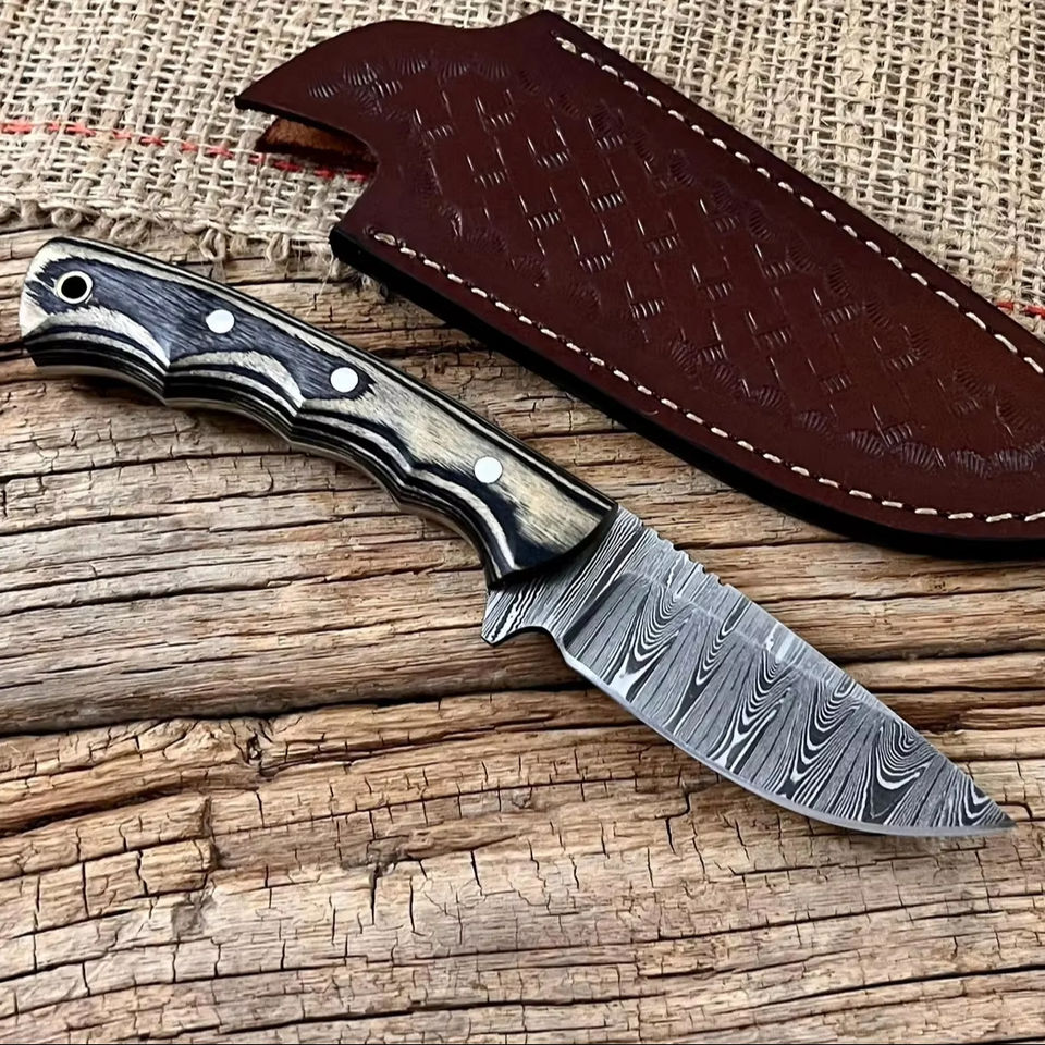 มีดดาบเหล็กดามัสกัสแบบฟอร์จสั่งทำพิเศษ ด้ามไม้ปักก้า ปลอกหนัง OEM ฟูลแทง สำหรับล่าสัตว์และแล่เนื้อ