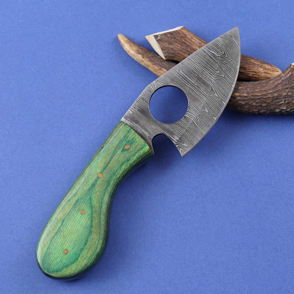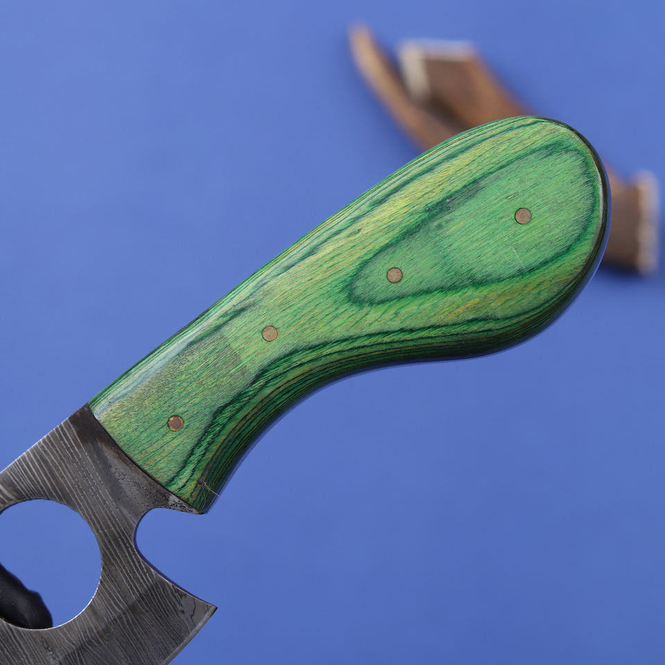 มีดเดินป่าดามัสกัสแบบฟอร์จสั่งทำพิเศษ ด้ามจับไม้ปักก้า ปลอกหนัง OEM ฟูลแทงค์ ขนาดกะทัดรัด สำหรับตั้งแคมป์และใช้งานทั่วไป