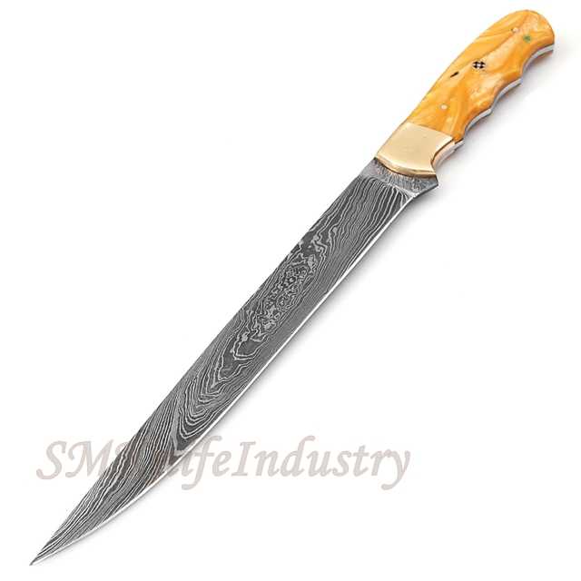 มีดเหล็กดามัสกัสปลอมพร้อมปลอกหนังด้ามจับเรซินสำหรับห้องครัวและตกปลาสไตล์ใหม่