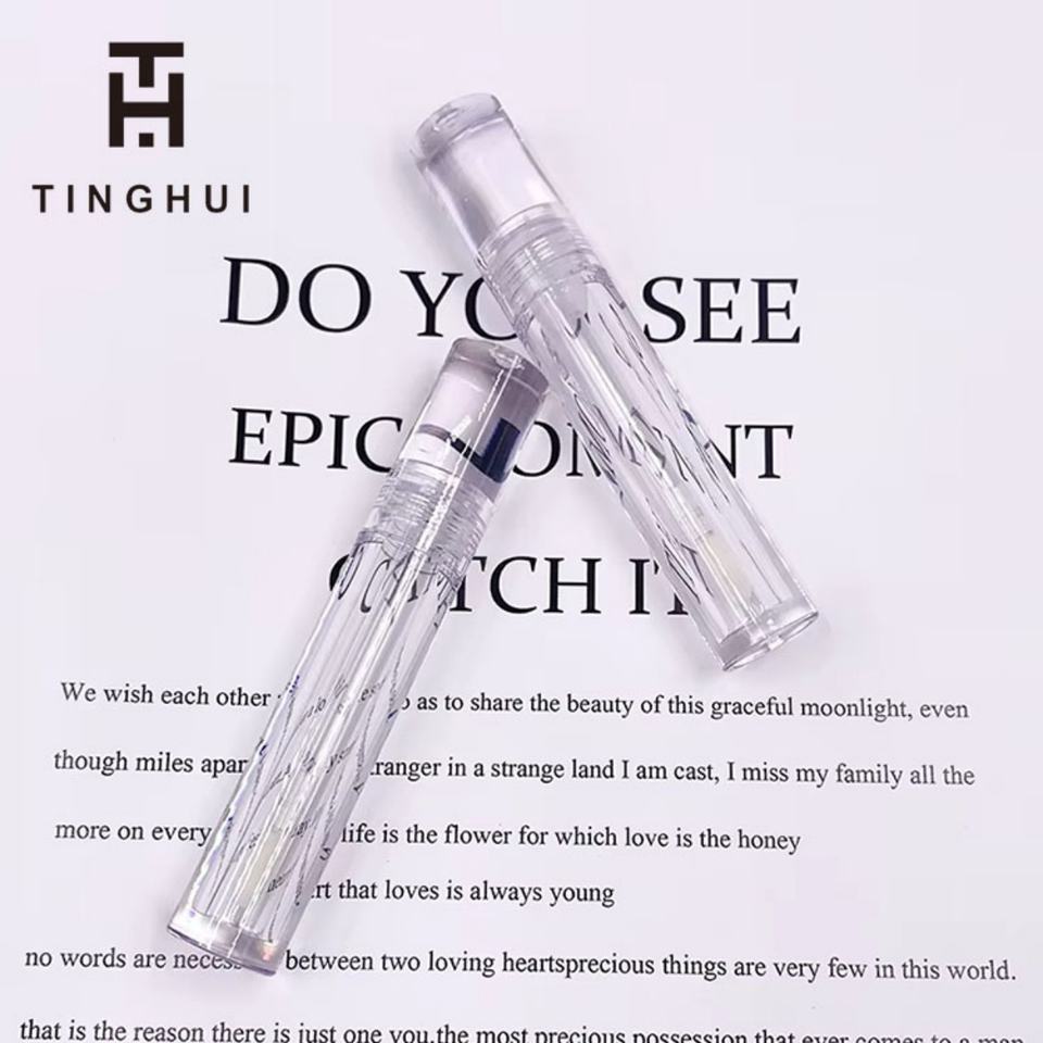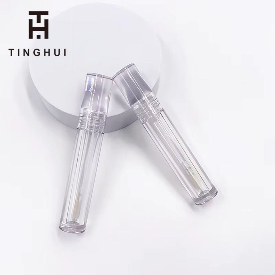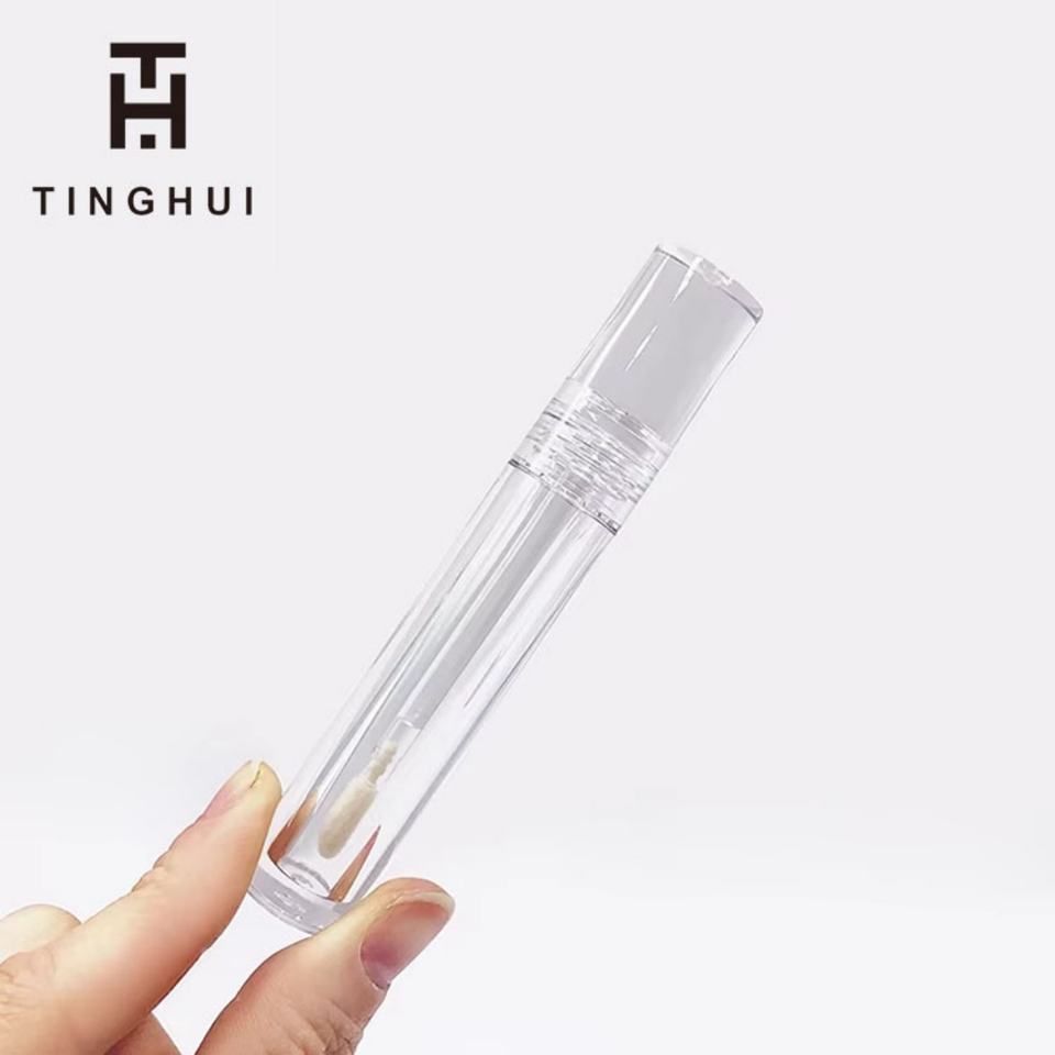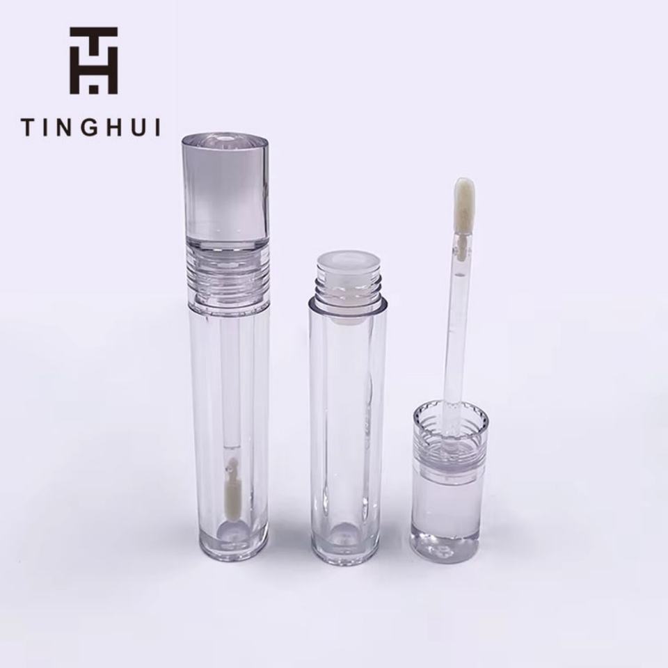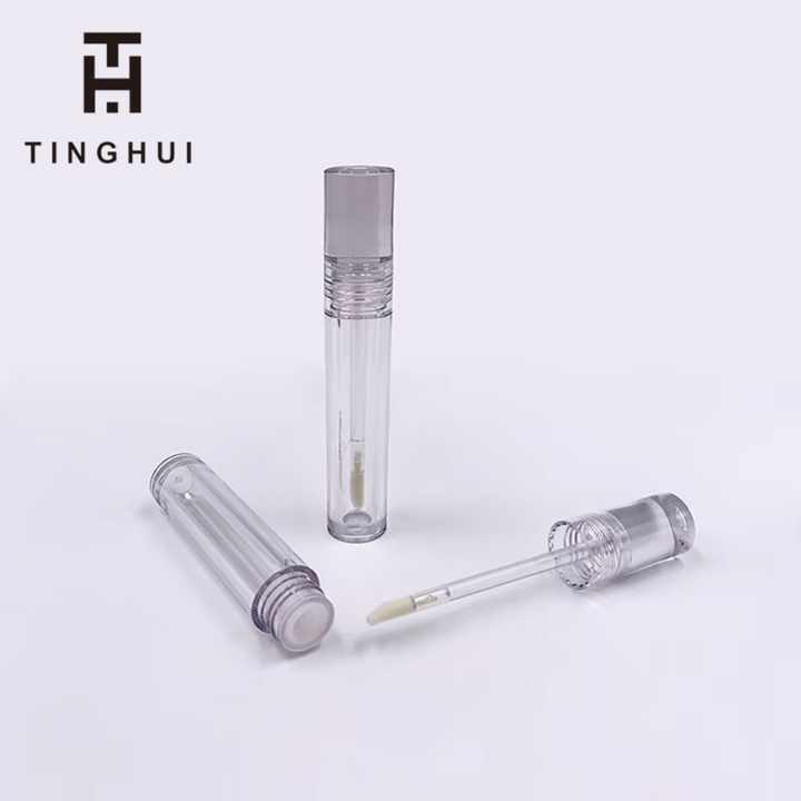 บรรจุภัณฑ์ลิปกลอสแบบรีไซเคิลได้ ตัวอย่างฟรี แบบกำหนดเอง หลอดลิปกลอสเปล่าทรงกลม โปร่งใสเต็มที่ พร้อมแปรงทาลิปสติก