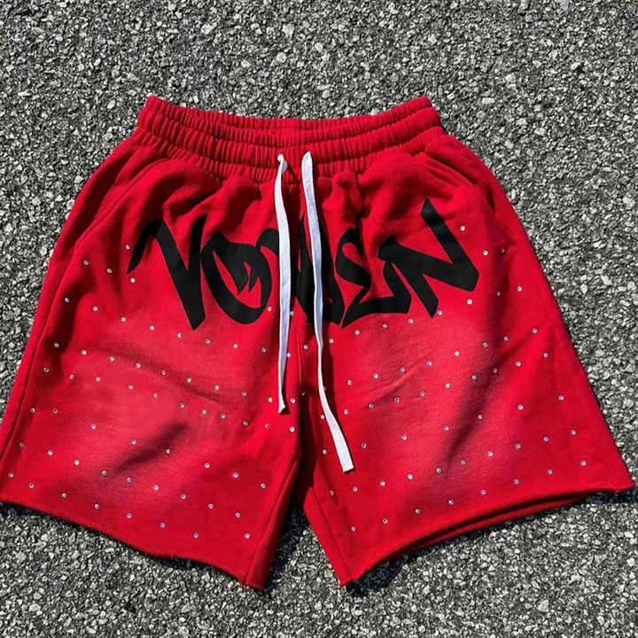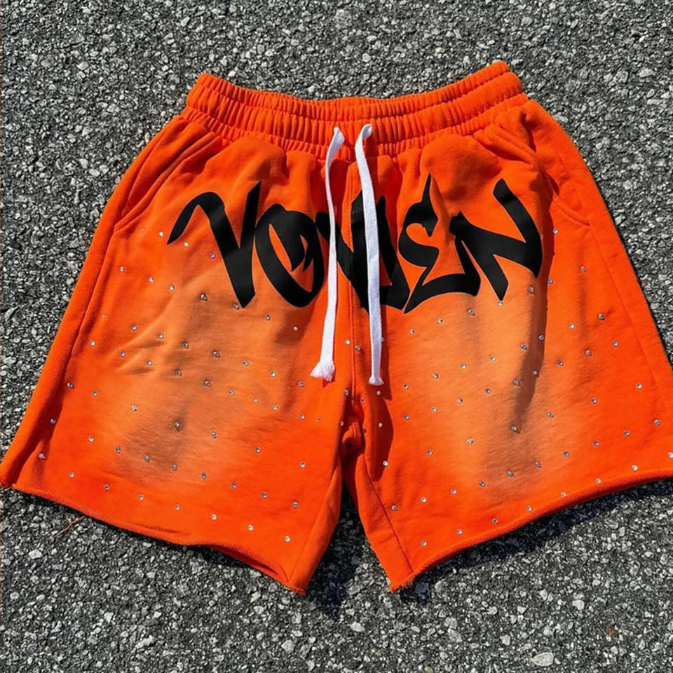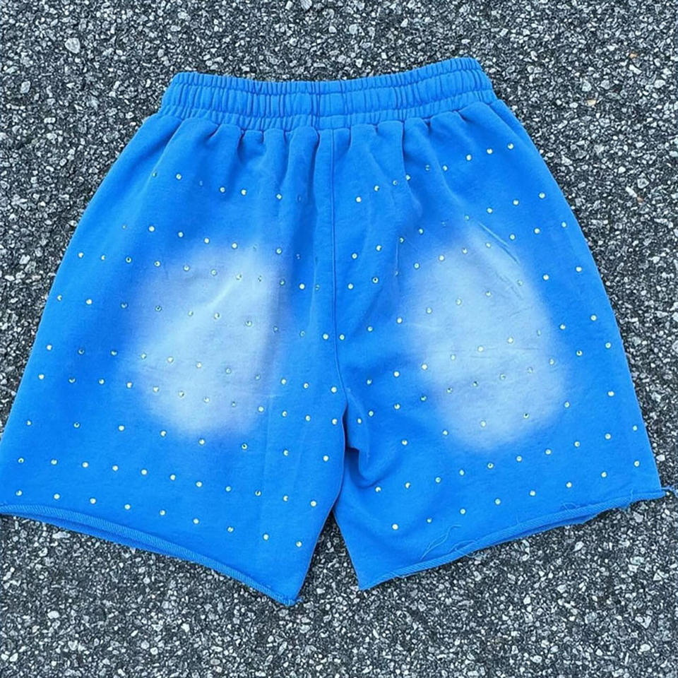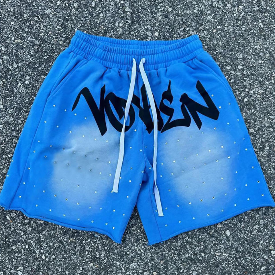 กางเกงขาสั้นผู้ชายสไตล์สตรีทแฟชั่นผ้าเฟรนช์เทอร์รี่แบบกำหนดเอง ประดับคริสตัล 100% ผ้าฝ้าย บริการ OEM ล้างสีแบบซันเฟดและสโตนวอช