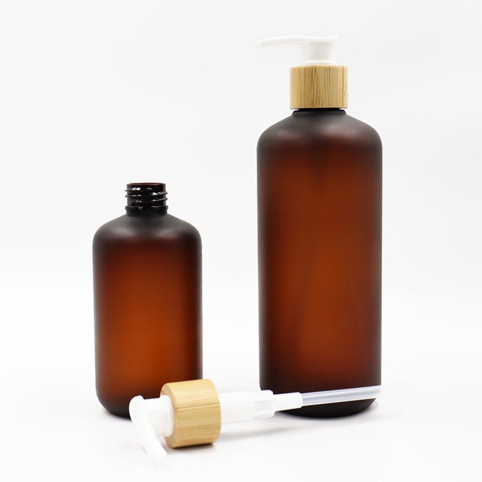 ขวดพลาสติกสีเหลืองอำพันแบบฝ้าพิมพ์ลายสกรีน ขนาด 50 มล.-500 มล. สำหรับแชมพูและครีมนวดผม พร้อมฝาไม้ไผ่และหัวปั๊ม PET