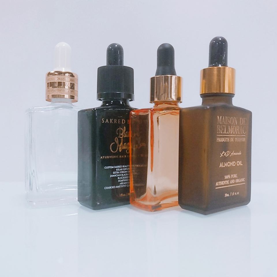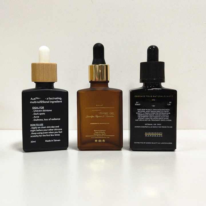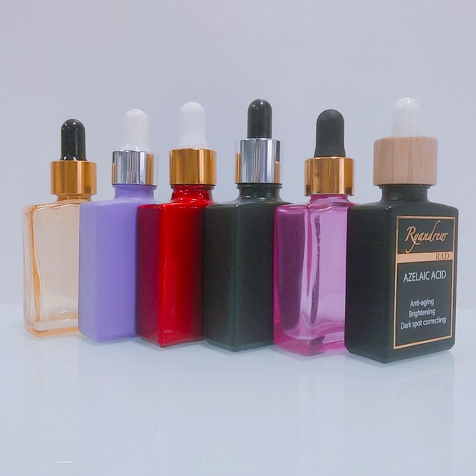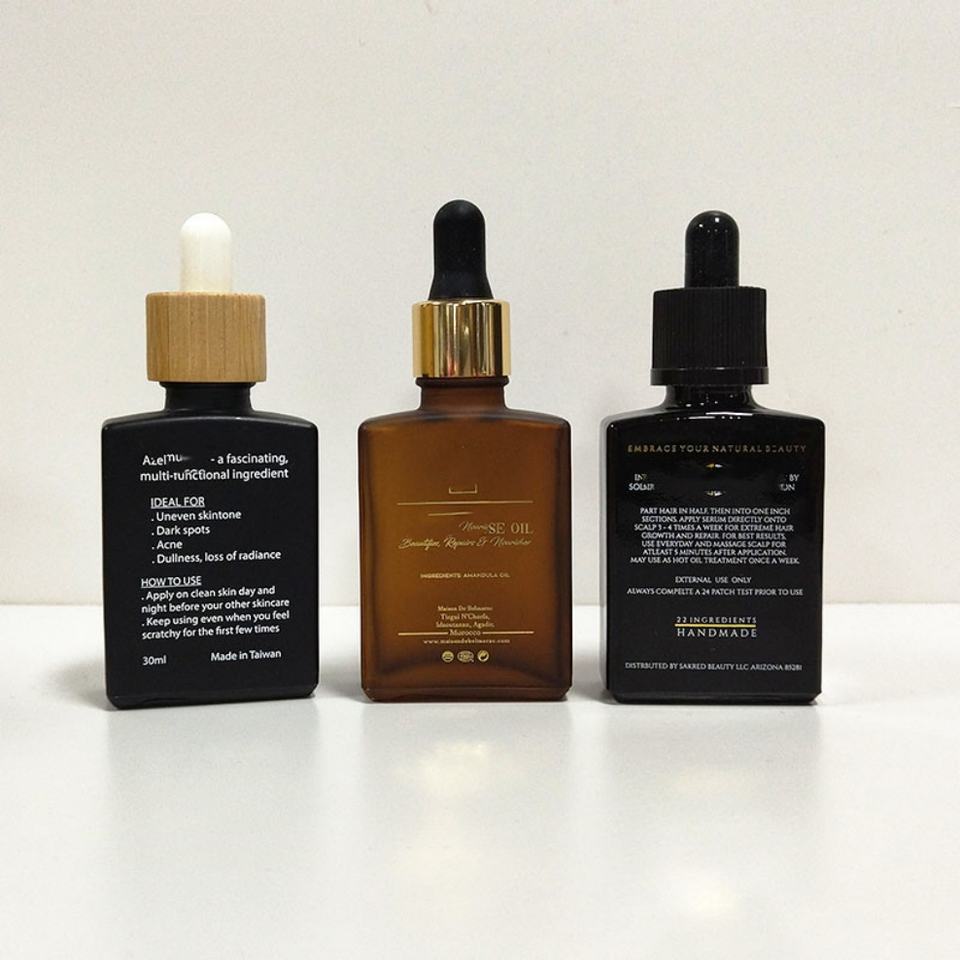 ขวดหยดสี่เหลี่ยมสีอำพันขุ่นแบบกำหนดเอง 30 มล. ขวดหยดแก้วสีน้ำตาลอำพันขุ่นสี่เหลี่ยมผืนผ้าสีดำ