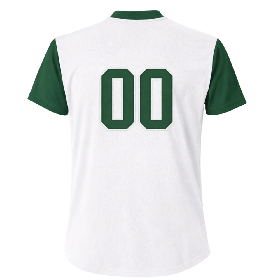 เสื้อซอฟต์บอลแบบสั่งทำพิเศษ ลายพิมพ์แบบ Dye Sublimation สีขาวเขียว คอติดกระดุม ชุดทีมพร้อมหมายเลขด้านหลัง ทรงพอดีตัวแบบนักกีฬา
