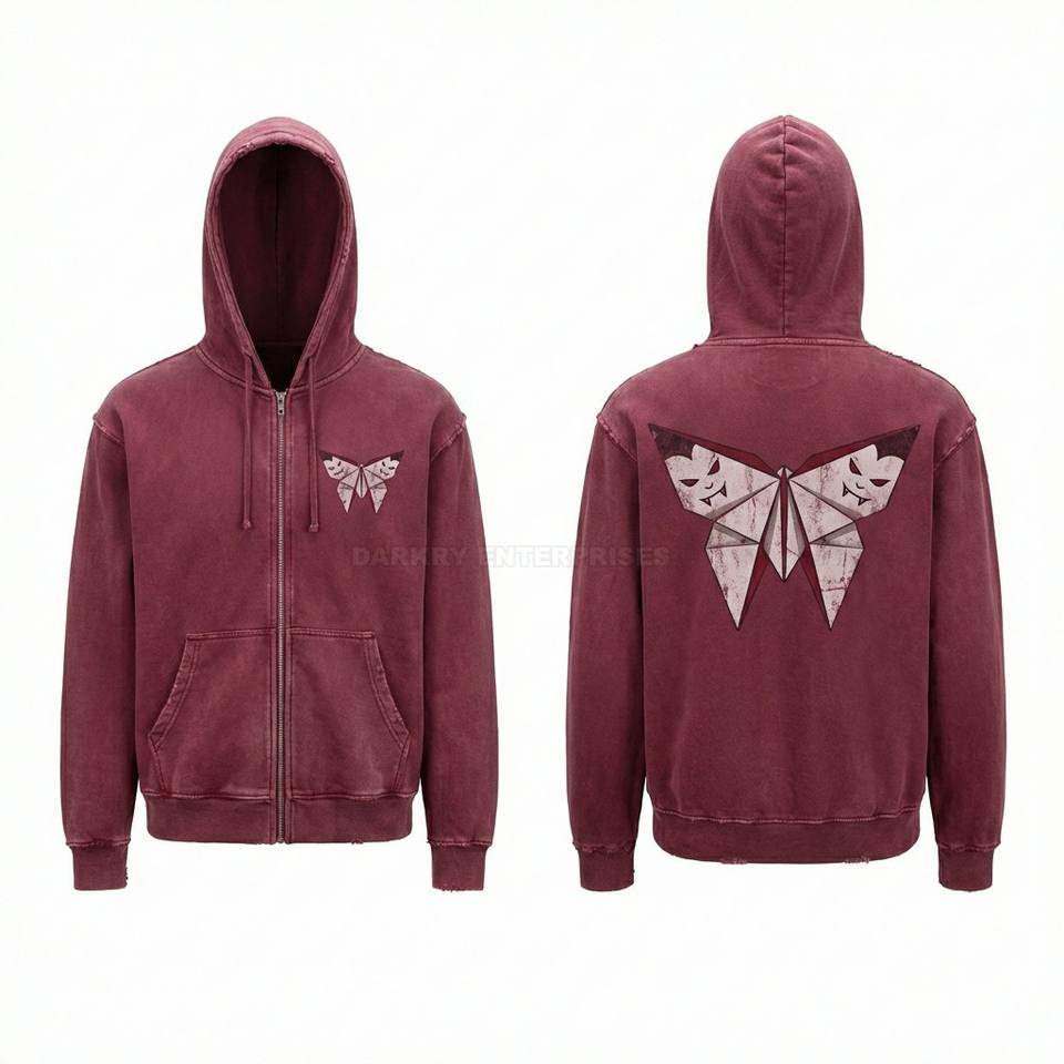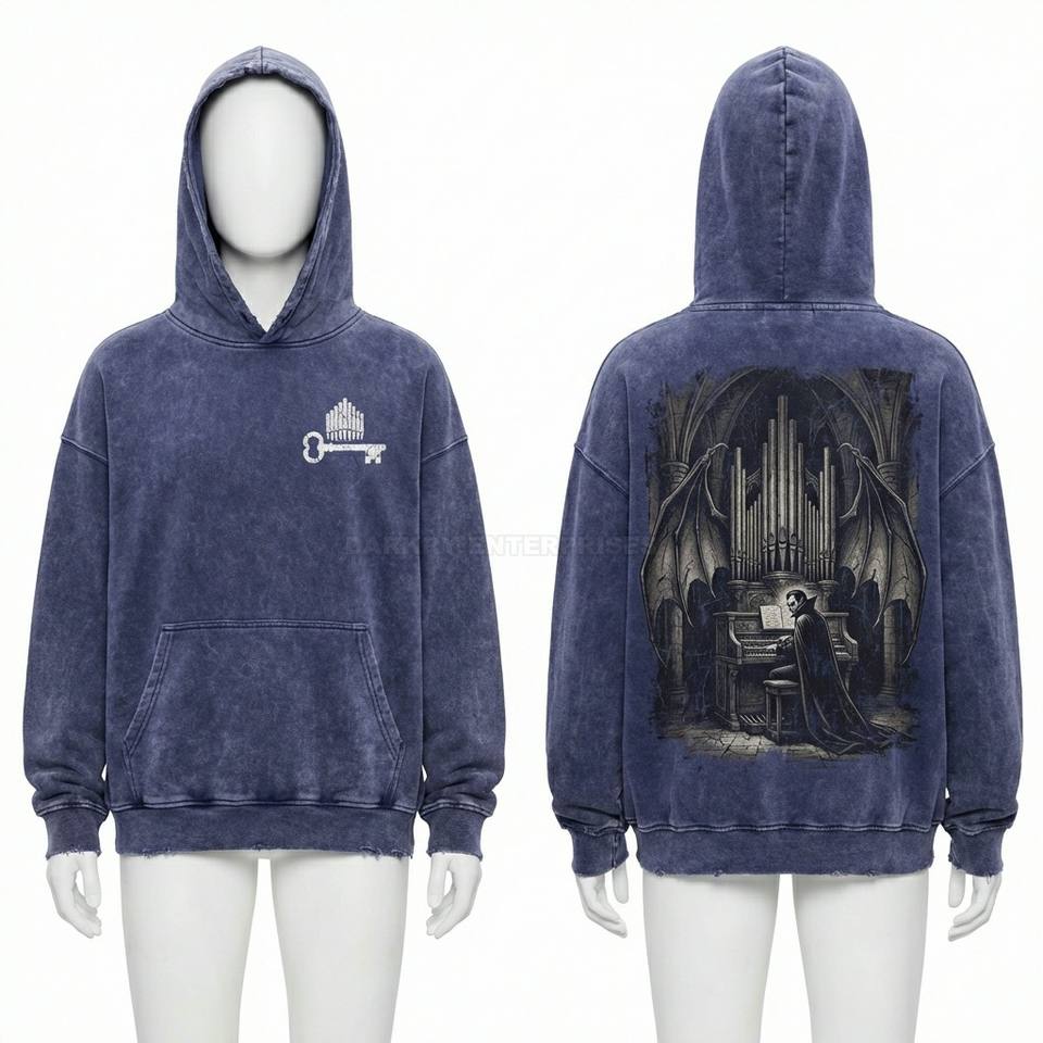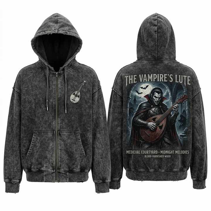 เสื้อฮู้ดซิปเต็มตัวสีเทาแบบ Mineral Wash ลายกราฟิก Vampire Lute สไตล์ยุคกลาง สำหรับผู้ชาย เสื้อฮู้ดสตรีทแวร์ ผลิตตามสั่ง