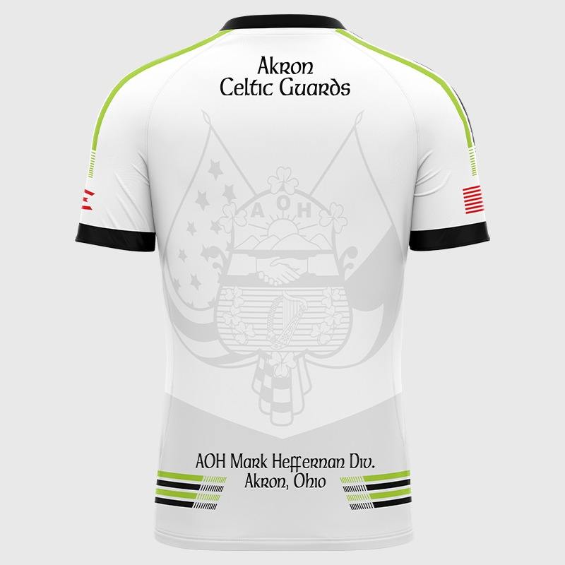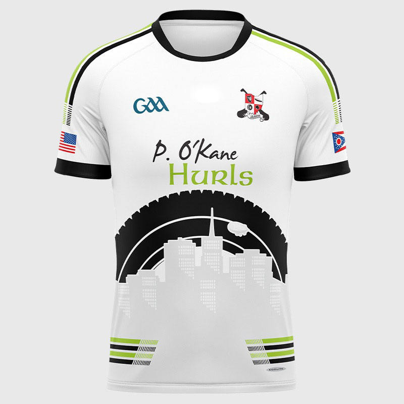 เสื้อฟุตบอล GAA เสื้อฟุตบอลผ้าโพลีเอสเตอร์100% ชุดเล่นฟุตบอลมีโลโก้ด้านหน้าแบบสั้นสีทึบออกแบบได้ตามต้องการ