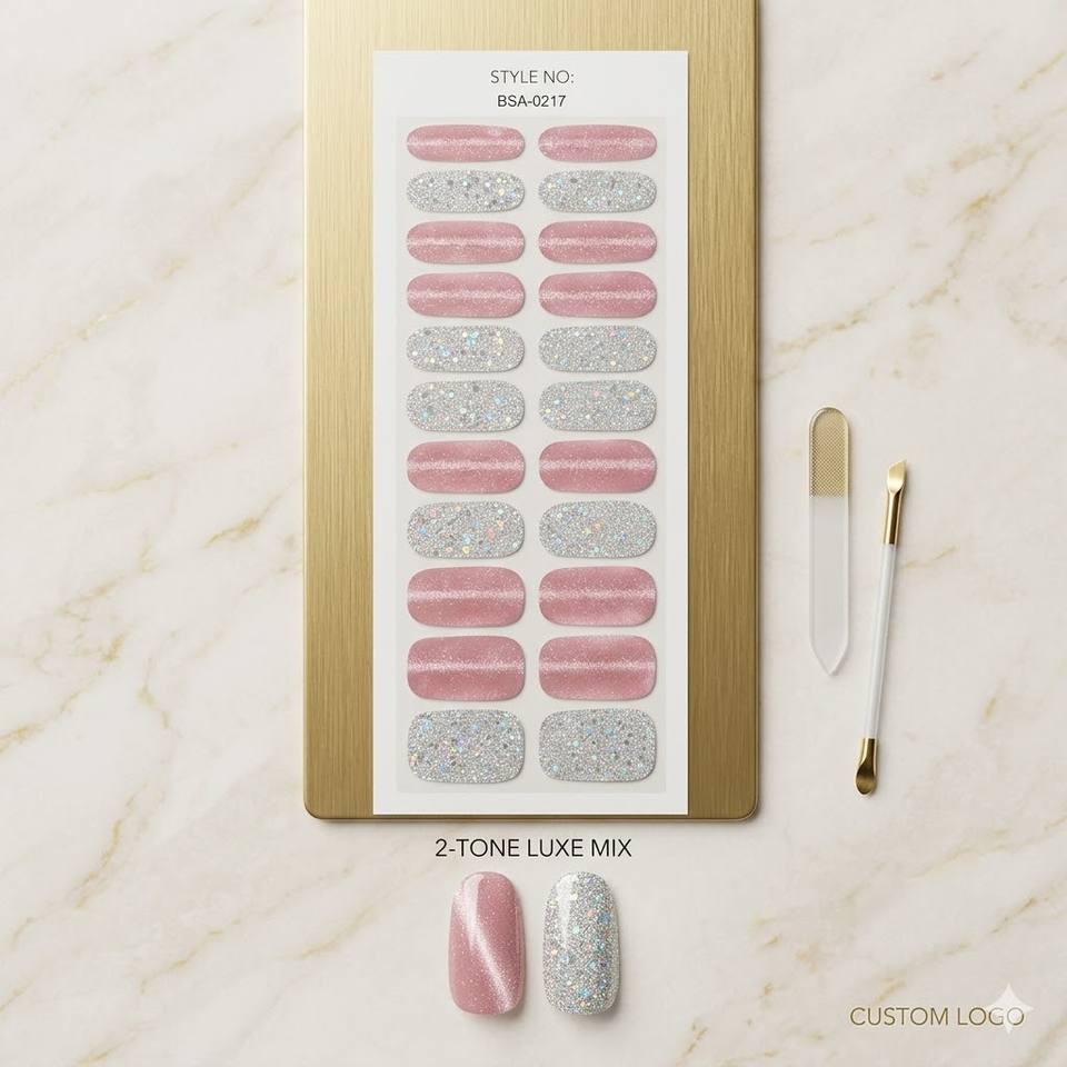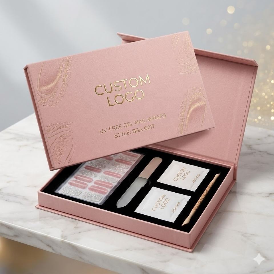 ชุดทำเล็บเจลแบบไม่ต้องอบ UV กล่องของขวัญสุดหรู สีชมพูกลิตเตอร์ ชุดทำเล็บกึ่งสำเร็จรูป ขายส่ง สติ๊กเกอร์ติดเล็บแบรนด์ส่วนตัว