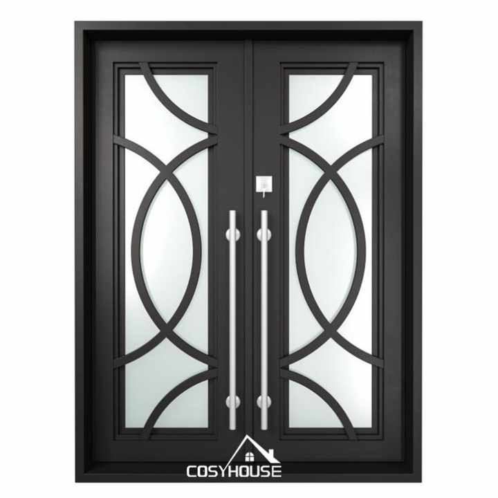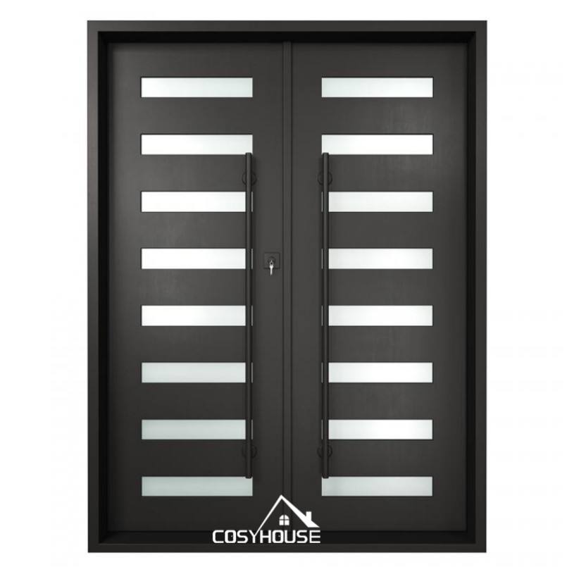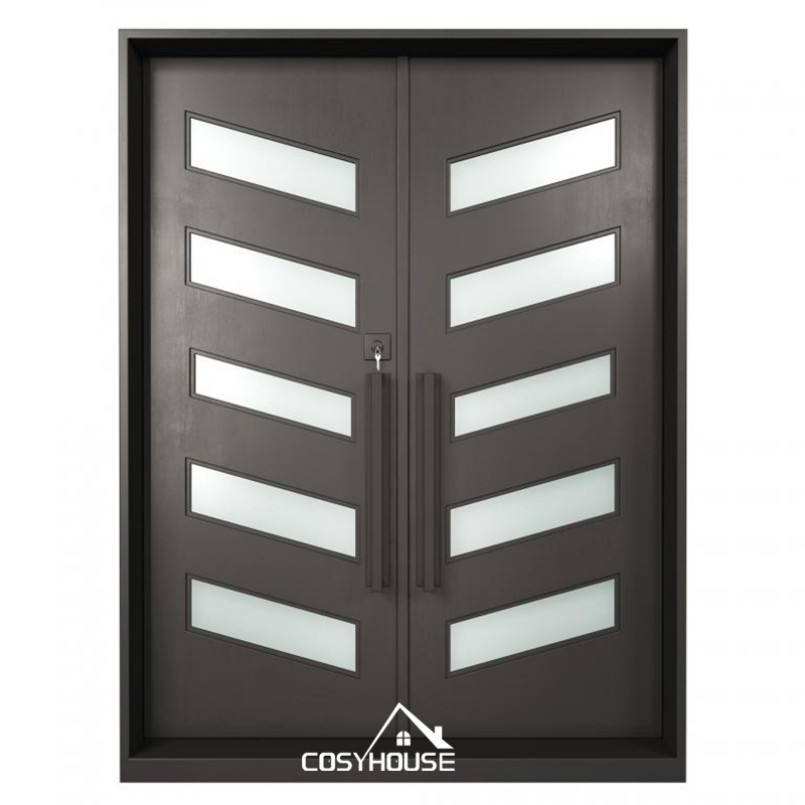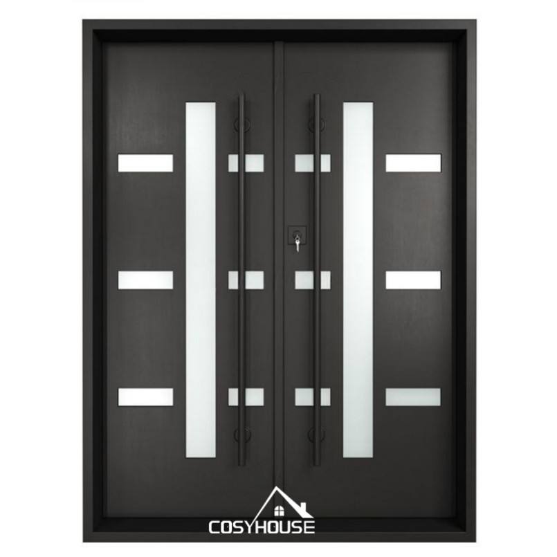 Custom Glass Double Doors Modern Black Iron Front Entry Doors for Villa Hotel House Exterior with Anti-Theft Finished Surface