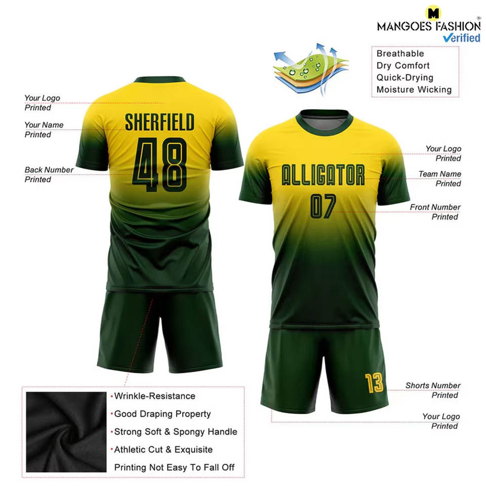 ชุดฟุตบอลสีเขียวทองแบบซับลิเมชั่นแฟชั่น แบบสั่งทำพิเศษ เสื้อและกางเกงขาสั้น สำหรับทุกเพศ ระบายอากาศได้ดี แห้งเร็ว ชุดกีฬาประสิทธิภาพสูง