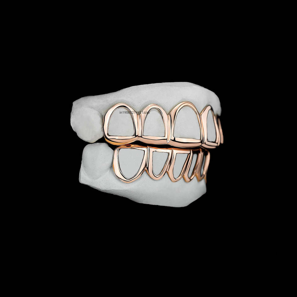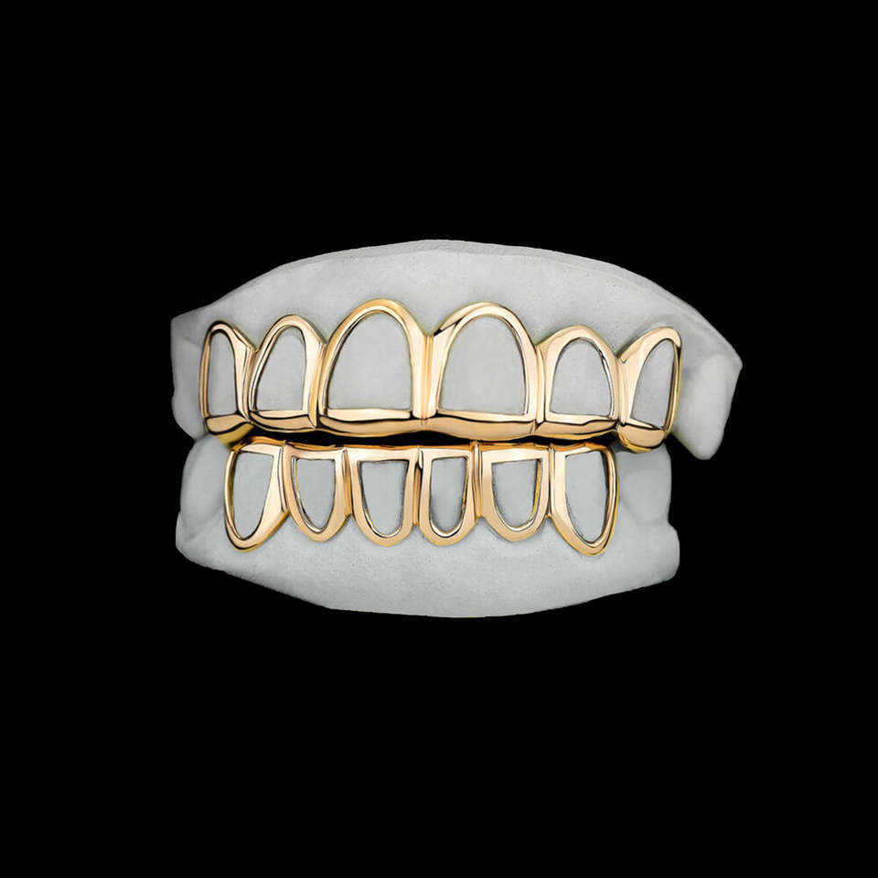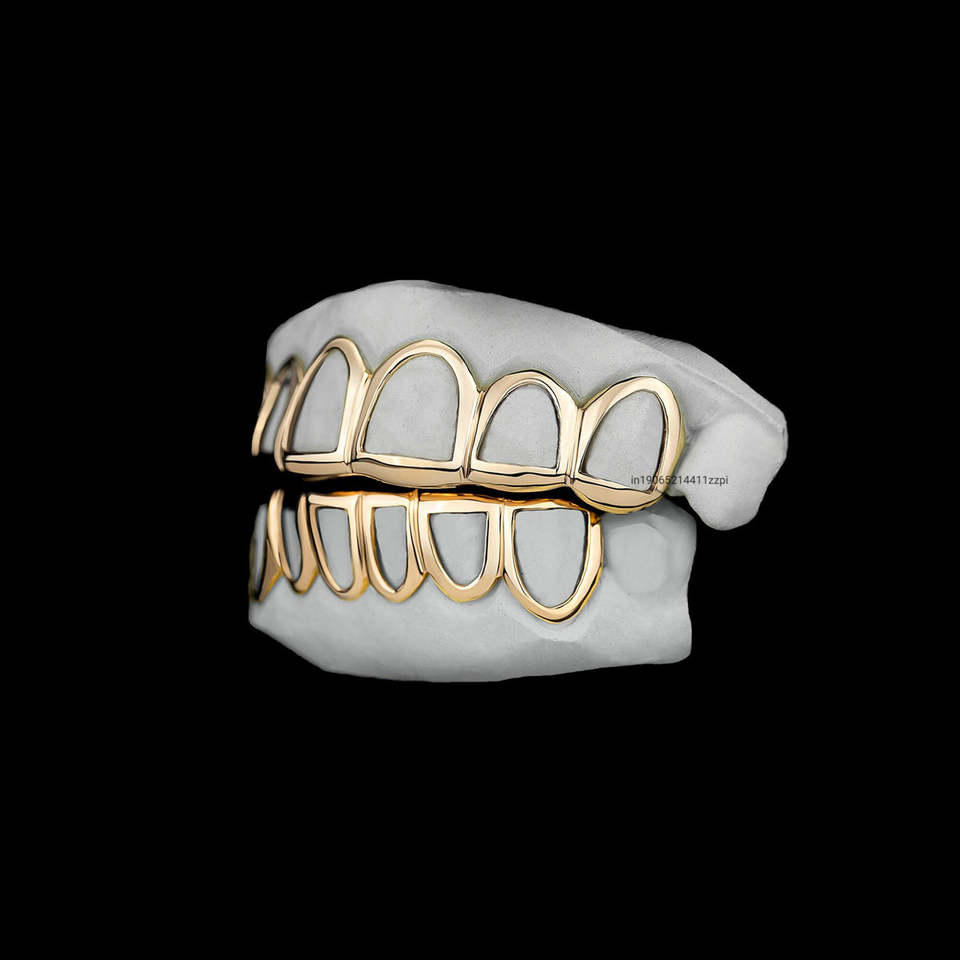 ชุดฟันปลอมแบบกริลล์ซสีทองแบบกำหนดเอง ด้านบนและด้านล่างแบบกลวง ผิวขัดเงา สไตล์มินิมอล ฮิปฮอป สำหรับผู้ชาย